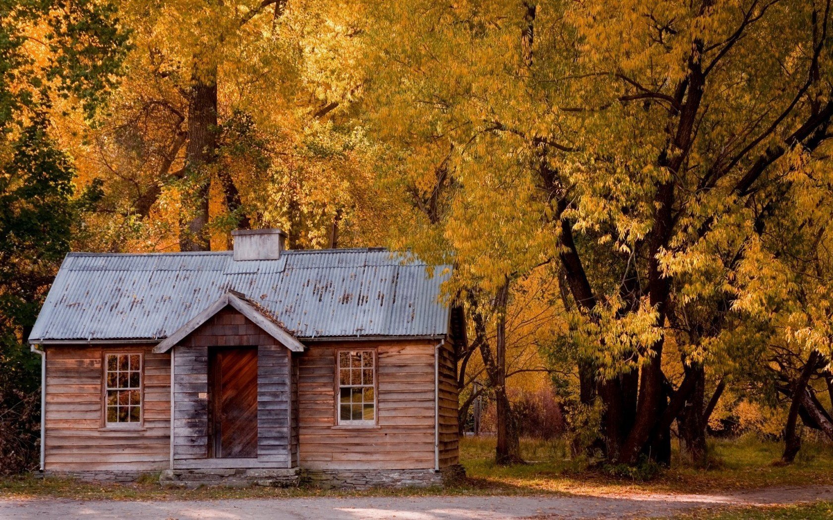 Herbsthaus im Wald mit gelben Blättern - wallpaper für das Telefon