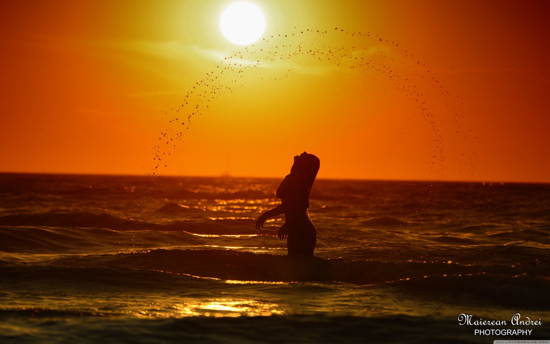Mädchen im Wasser auf Sonnenuntergang Hintergrund - wallpaper für das Telefon
