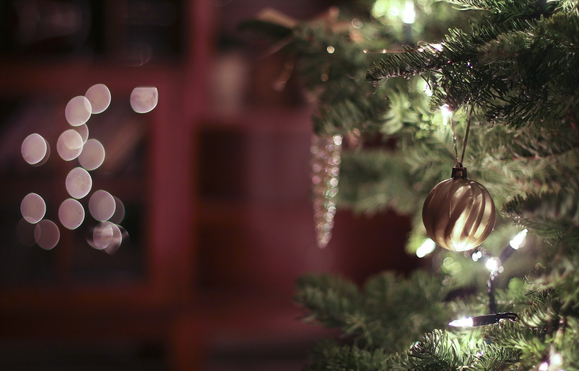 Zifferblatt und Christbaumspielzeug auf einem Ast