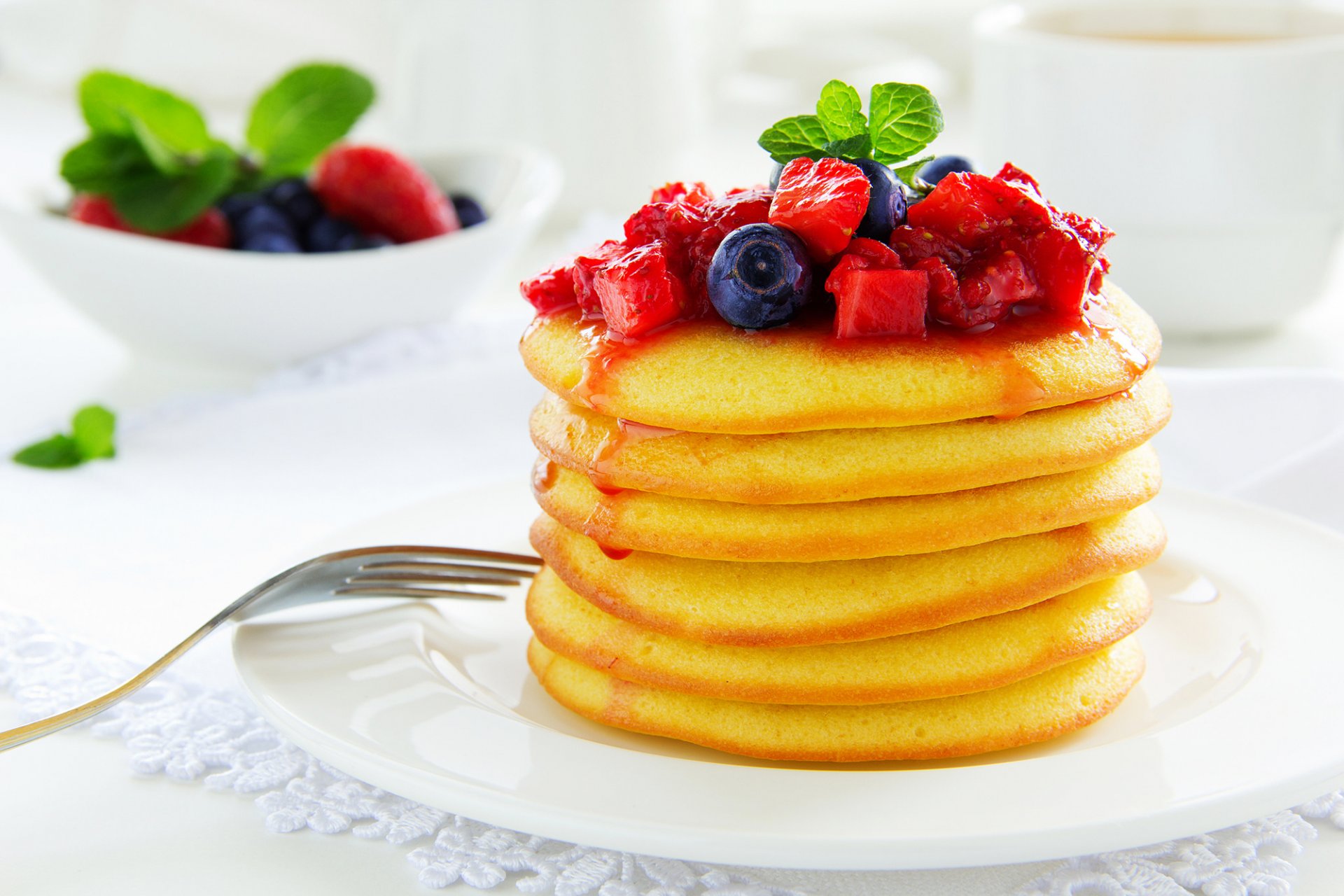 Obstsalat in einem großen schüssel mit löffel und minzeObstsalat in einem großen Schüssel mit Löffel und Minze