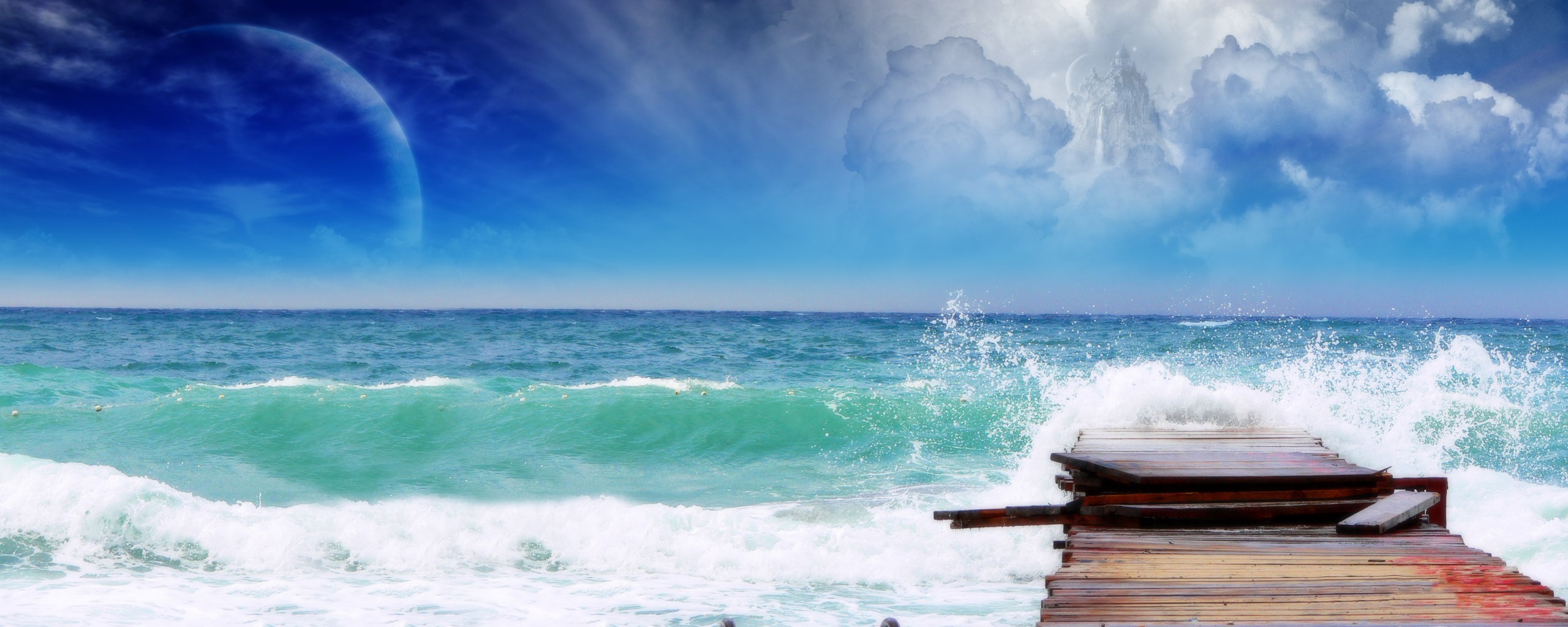 Grüne meereswellen brechen an einem steg unter blauem himmel auf, in dem eine luftburg aus wolken sichtbar istGrüne Meereswellen brechen an einem Steg unter blauem Himmel auf, in dem eine Luftburg aus Wolken sichtbar ist