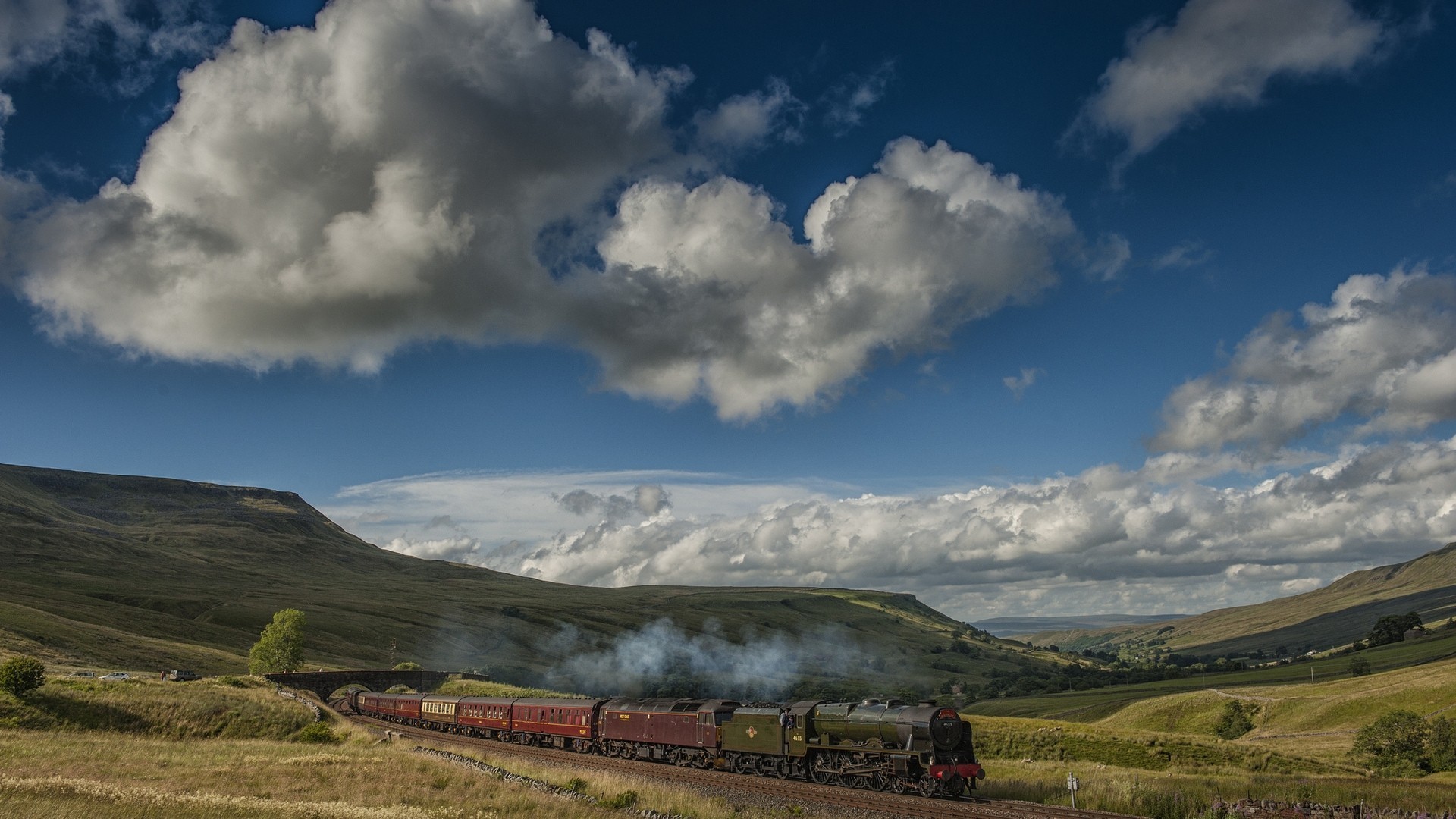 Zug mit Dampflok auf wunderschönem Gelände mit Wolken