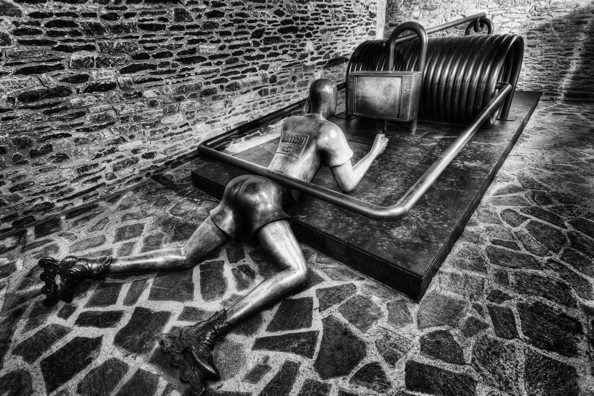 Skulptur eines mannes, der in eine mausefalle geraten istSkulptur eines Mannes, der in eine Mausefalle geraten ist