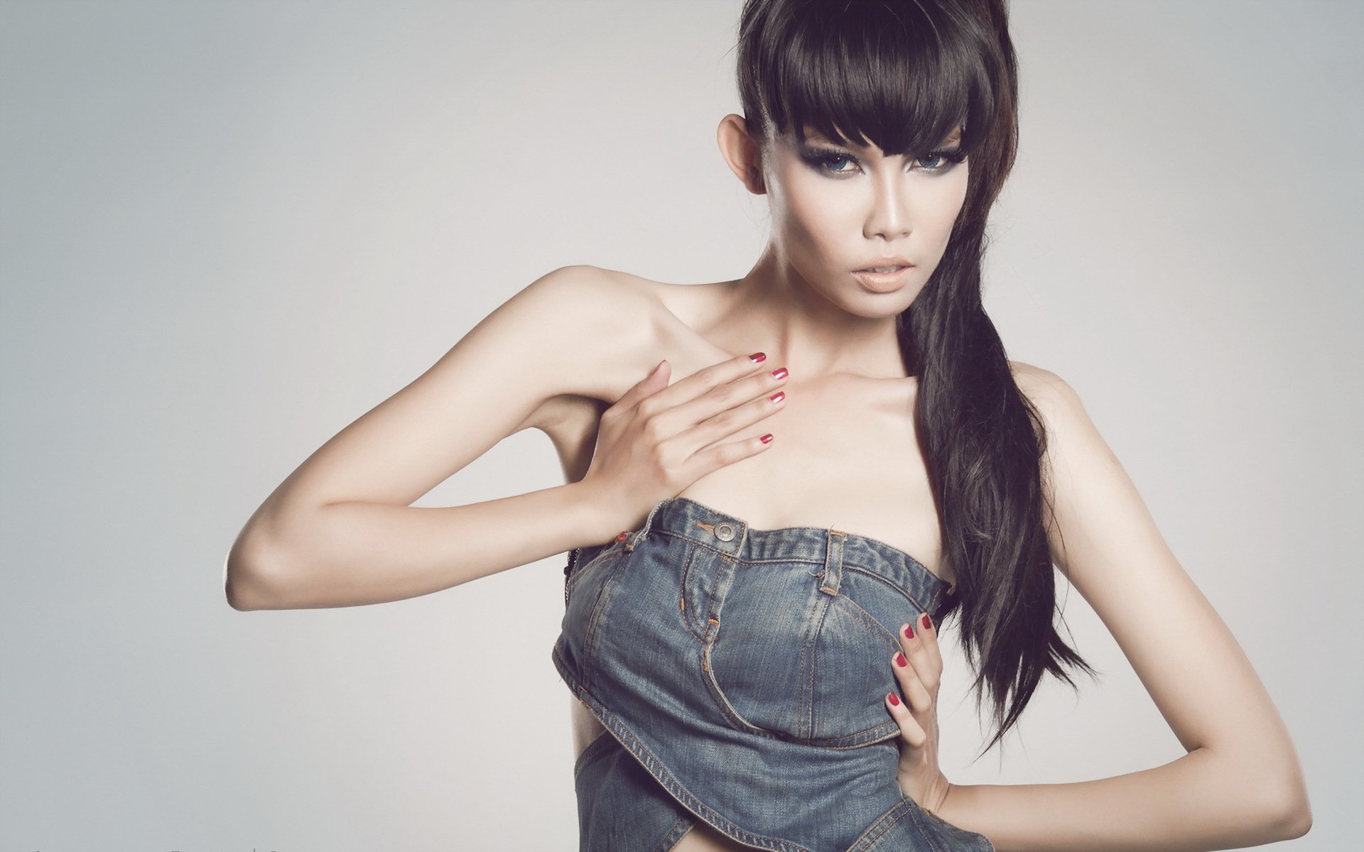Asiatisches Modell in einem Jeanskleid