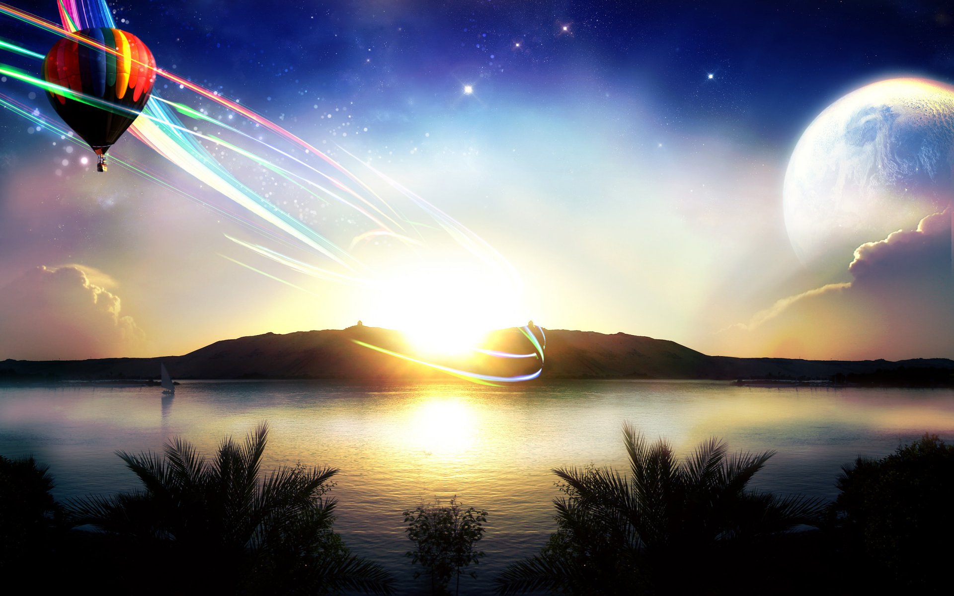 Ein ballon über dem meer in den strahlen des sonnenuntergangsEin Ballon über dem Meer in den Strahlen des Sonnenuntergangs