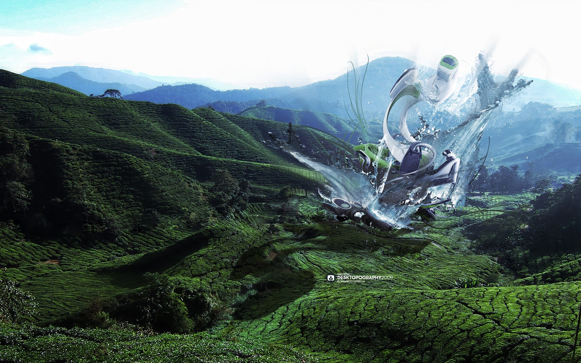 Futuristische explosion mitten in den grünen bergenFuturistische Explosion mitten in den grünen Bergen