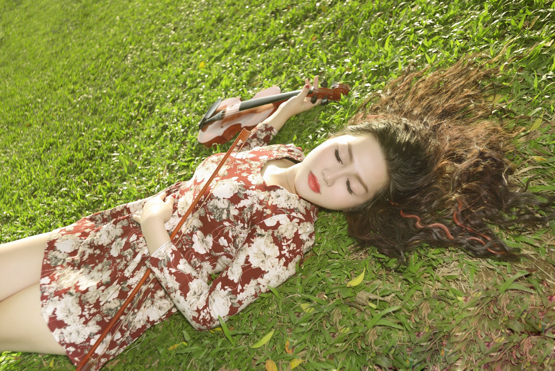 Verträumtes Mädchen liegt mit einer Geige