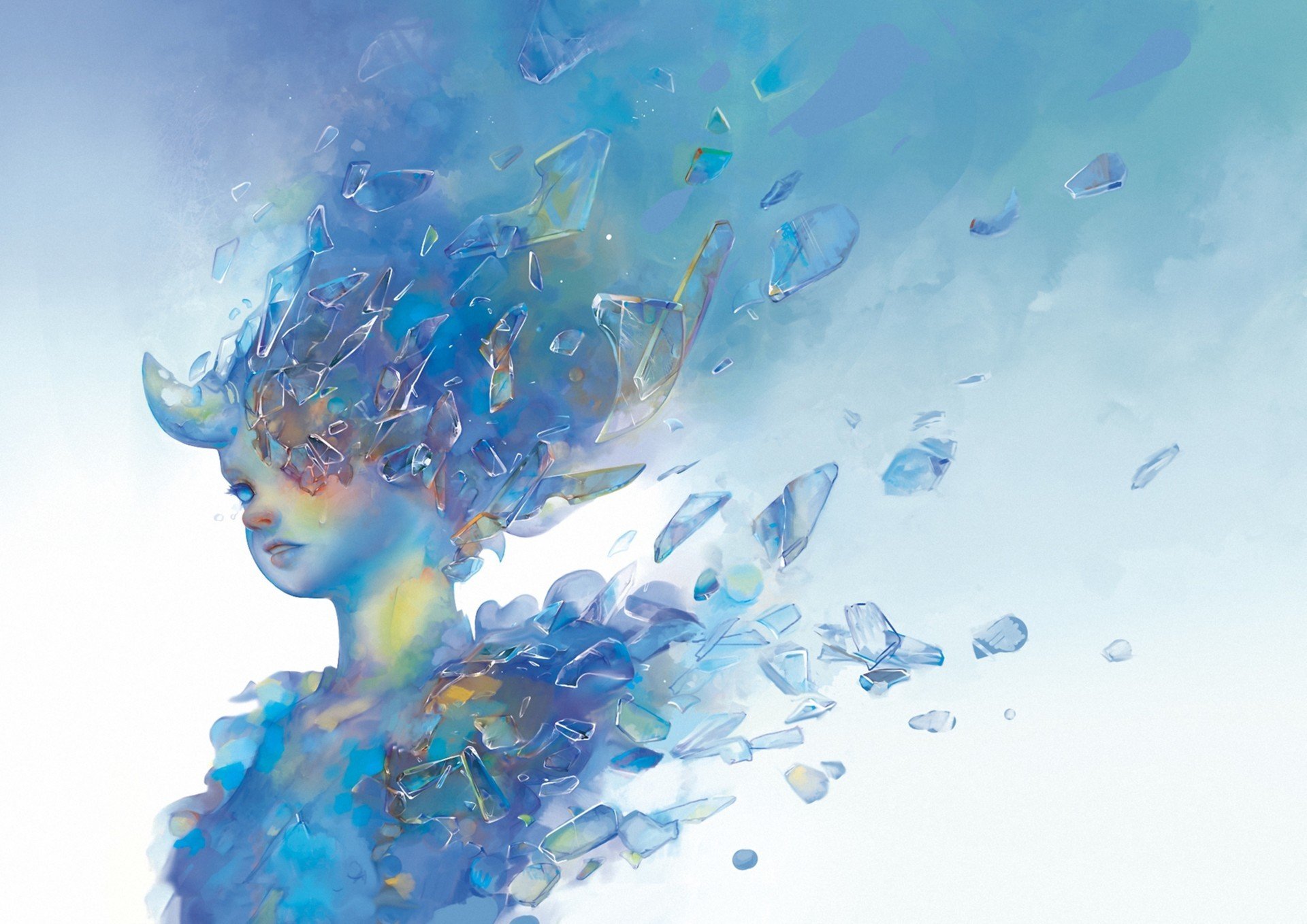 Das mädchen ist eine legende, die ein monster in den schneebedeckten bergen zügelt und eine waffe mit einem kristall in der hand hältDas Mädchen ist eine Legende, die ein Monster in den schneebedeckten Bergen zügelt und eine Waffe mit einem Kristall in der Hand hält