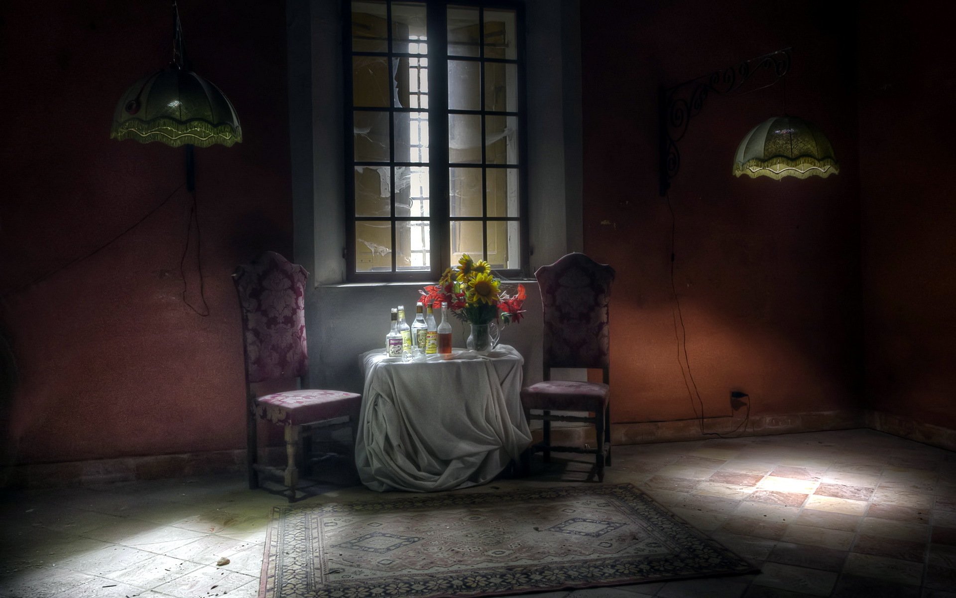 Ein düsterer raum mit einem fenster und einem stuhlEin düsterer Raum mit einem Fenster und einem Stuhl