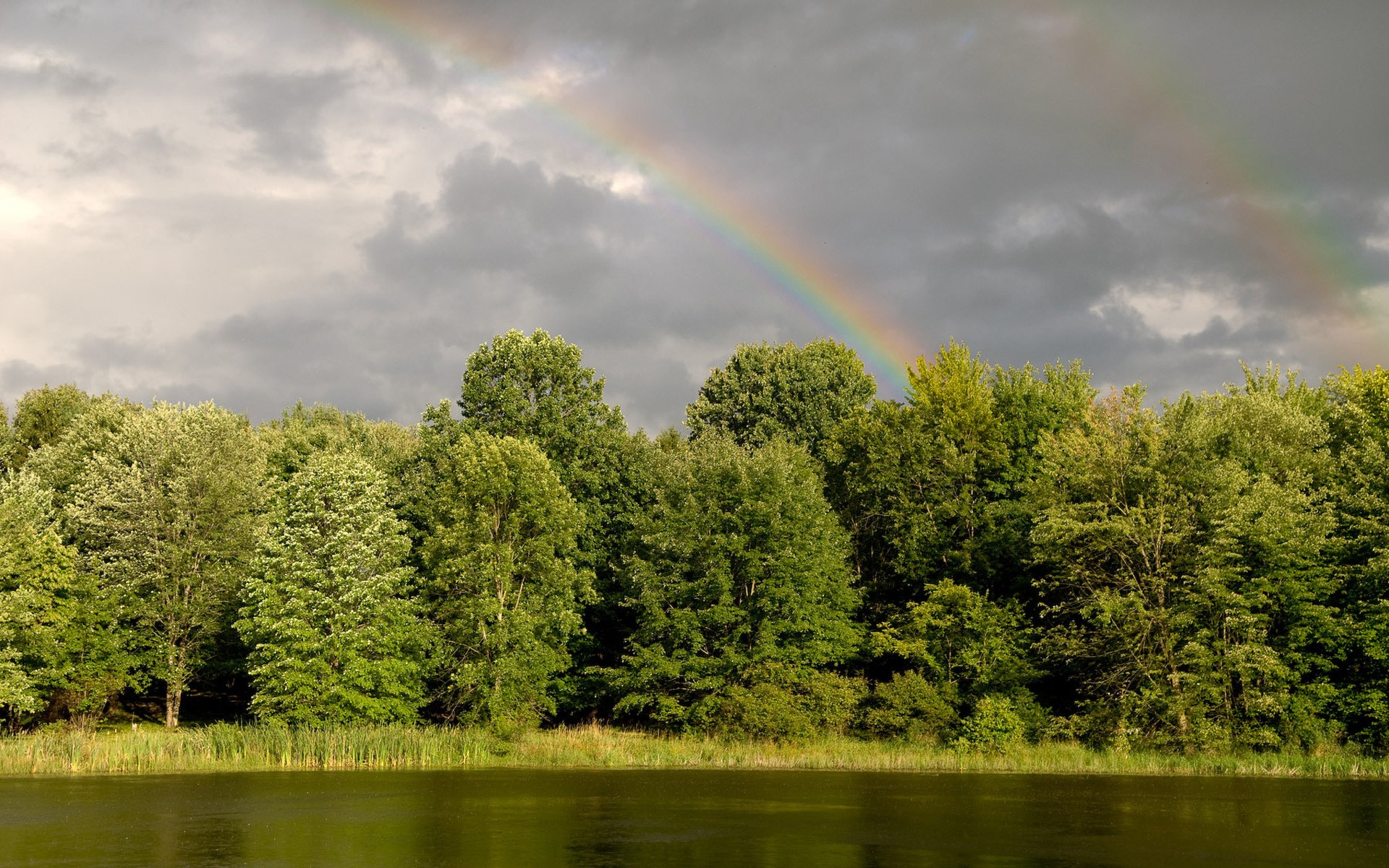 Am himmel über dem wald liegt ein regenbogen nach dem regenAm Himmel über dem Wald liegt ein Regenbogen nach dem Regen