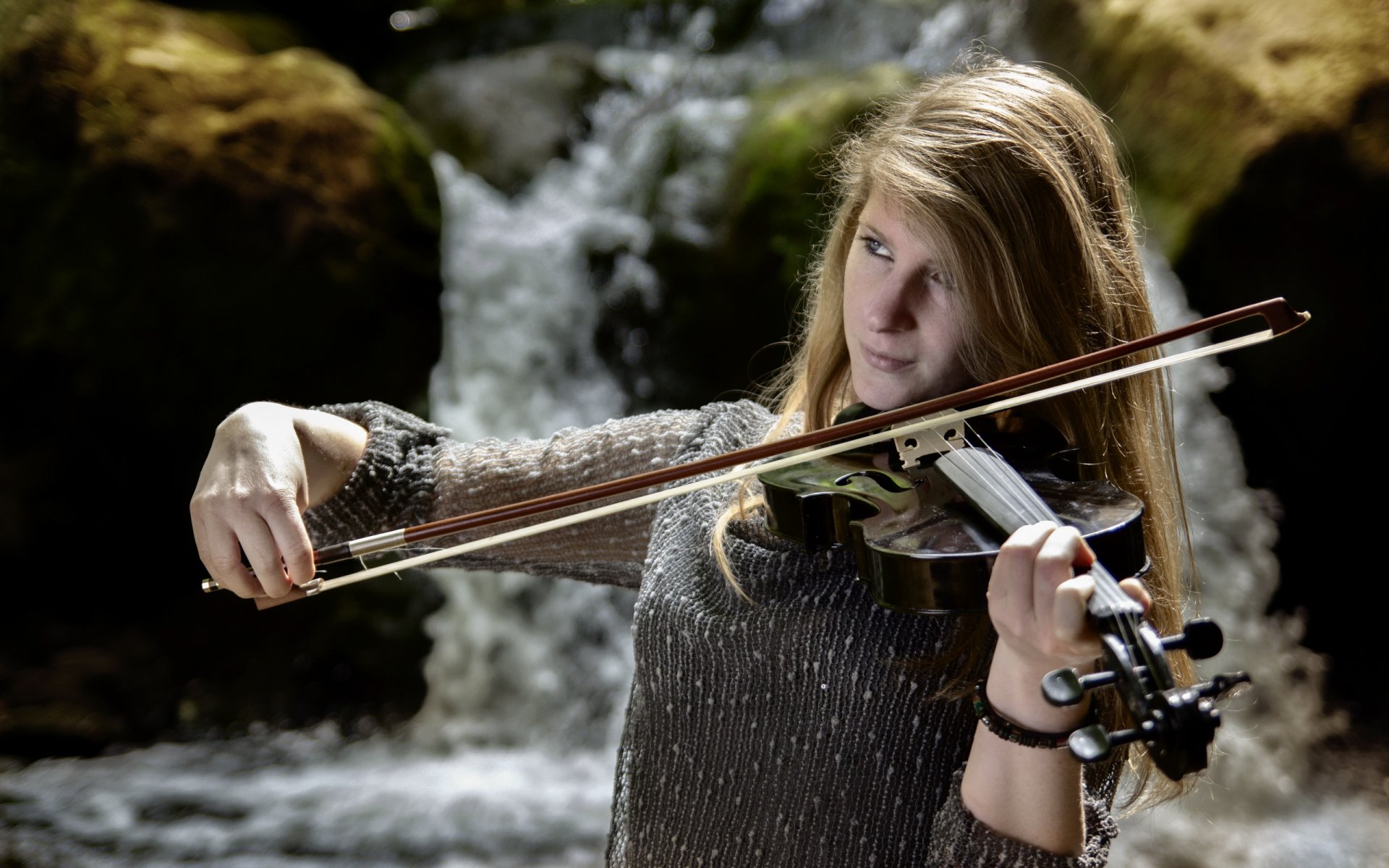 Orientalisches Mädchen im weißen Kleid spielt Geige