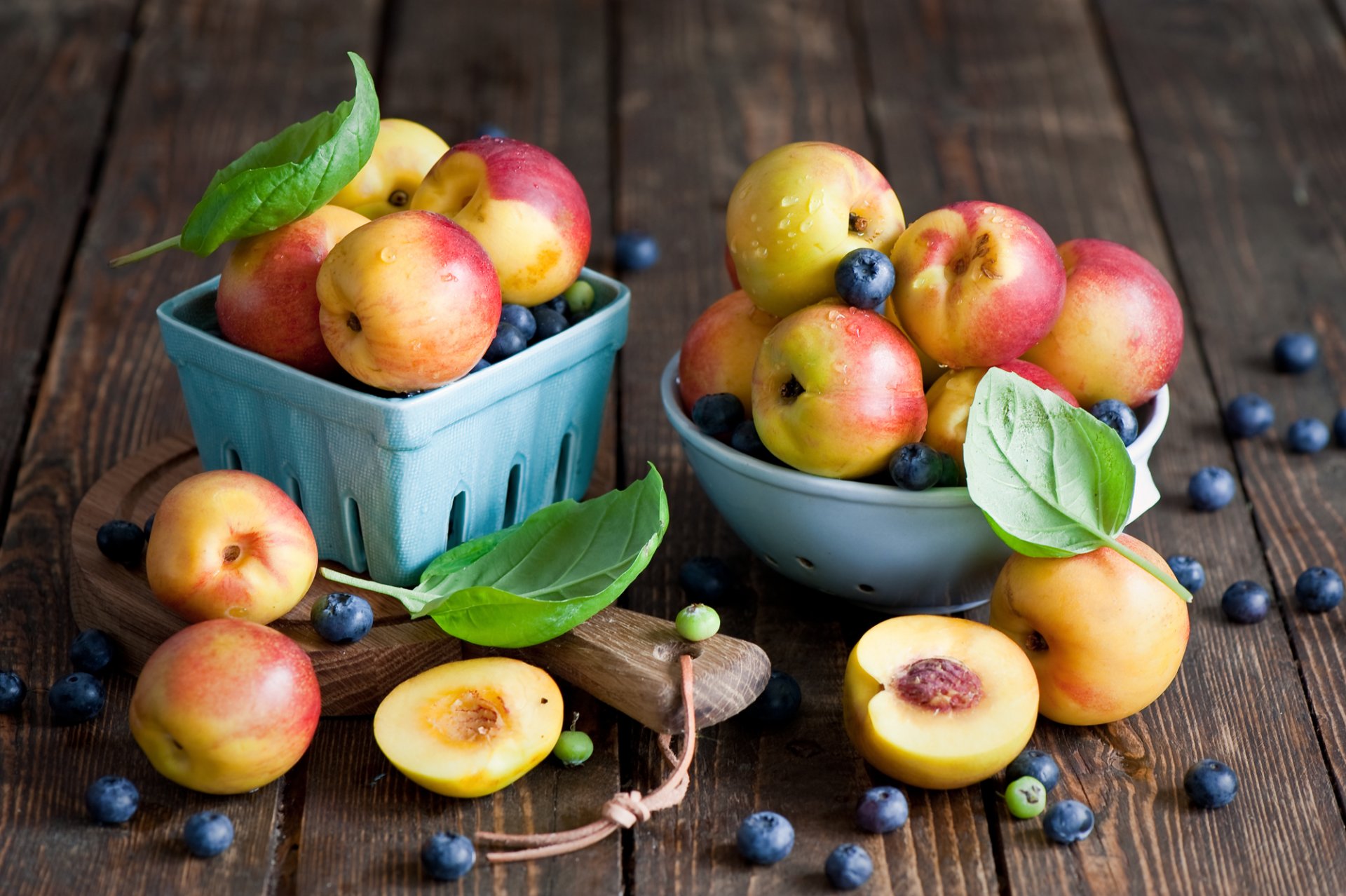 Ernte von reifen Pfirsichen und Blaubeeren