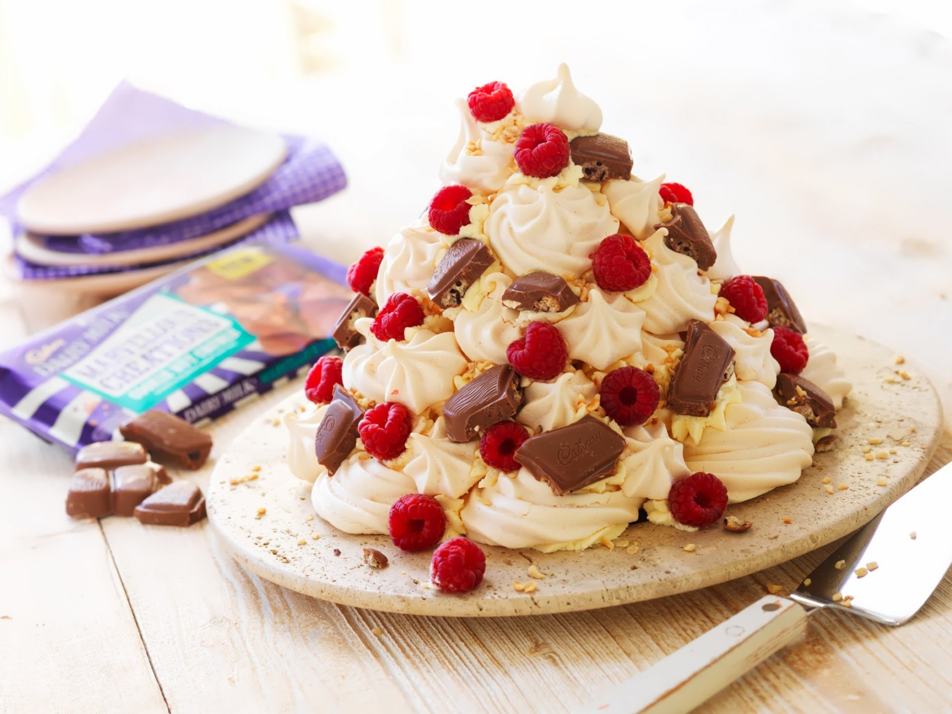 Cremiger Kuchen mit einem Netz aus Schokolade auf einer durchbrochenen Serviette