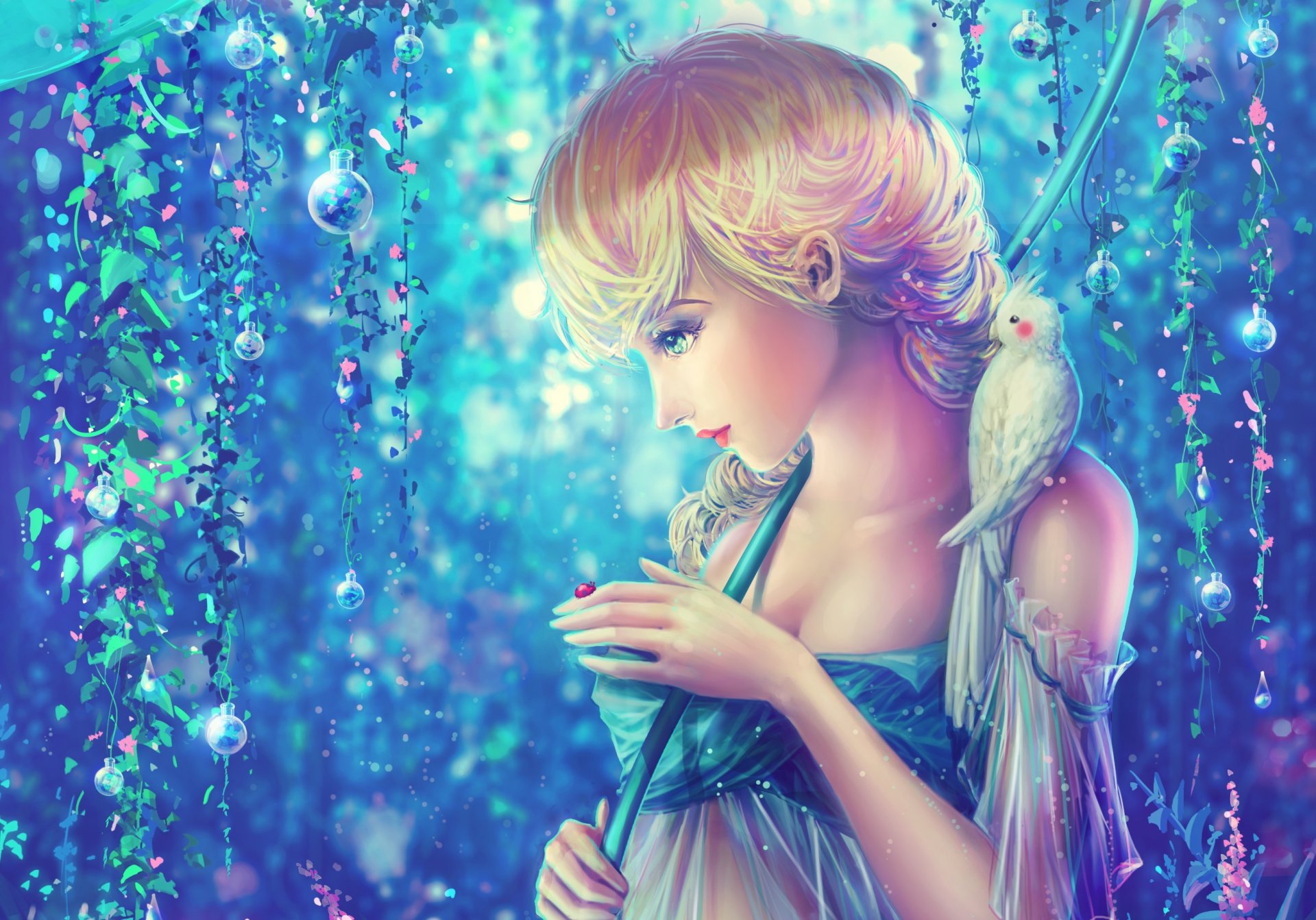 Ein mädchen mit einem papagei auf der schulter schaut auf einen marienkäferEin Mädchen mit einem Papagei auf der Schulter schaut auf einen Marienkäfer