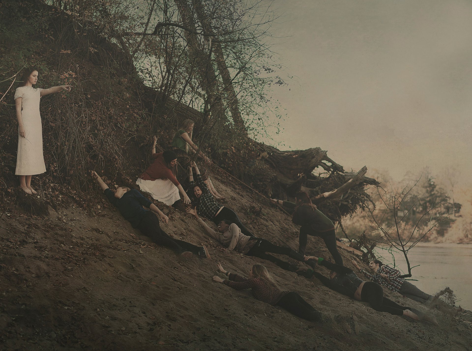 Das mädchen befiehlt den leuten, auf einer klippe aufzustehenDas Mädchen befiehlt den Leuten, auf einer Klippe aufzustehen