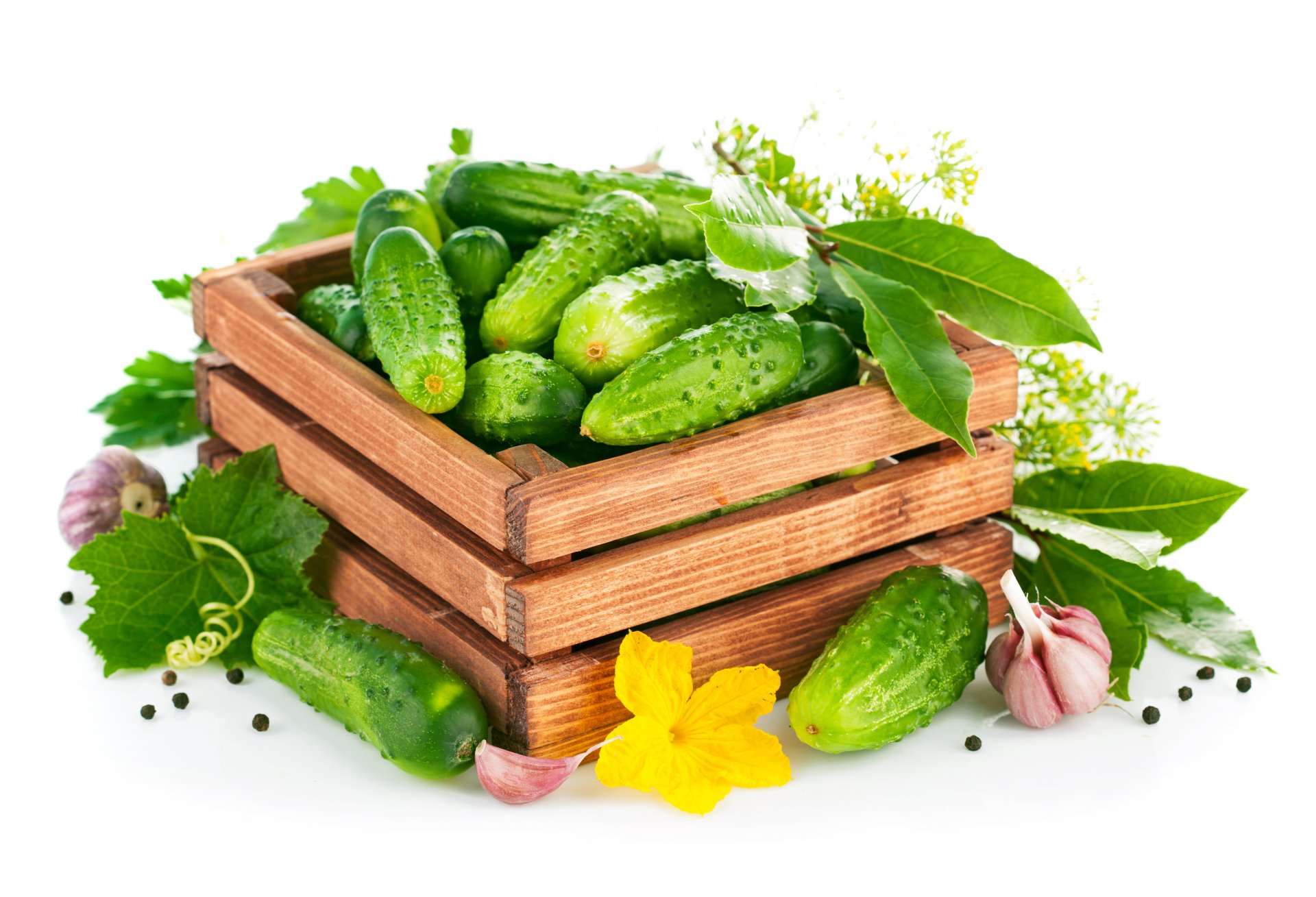 Gurkenerntekiste mit knoblauch, dill und lorbeerblättern verziertGurkenerntekiste mit Knoblauch, Dill und Lorbeerblättern verziert