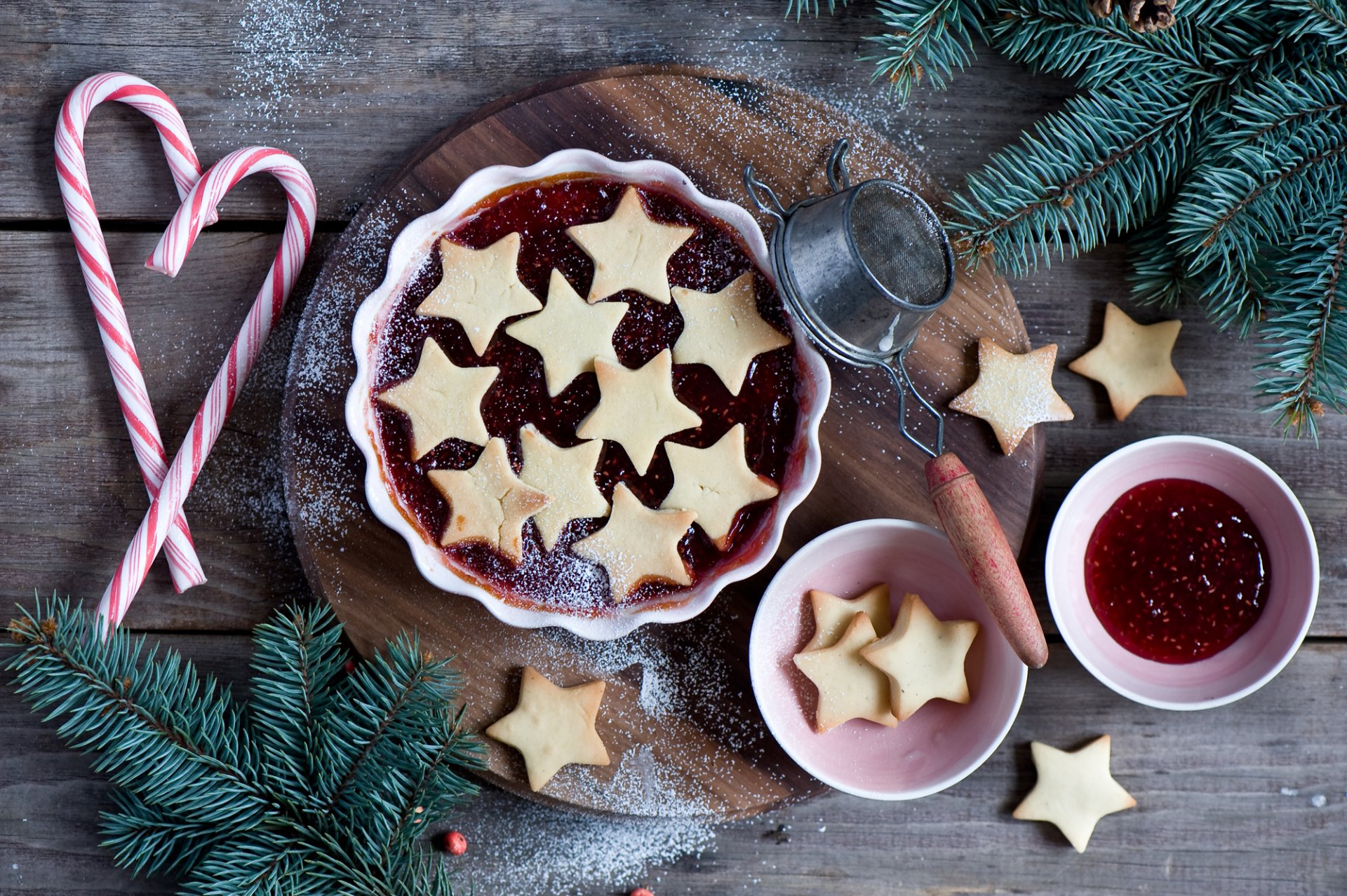 Weihnachtliche leckereien mit einem weihnachtsbaum auf dem tischWeihnachtliche Leckereien mit einem Weihnachtsbaum auf dem Tisch