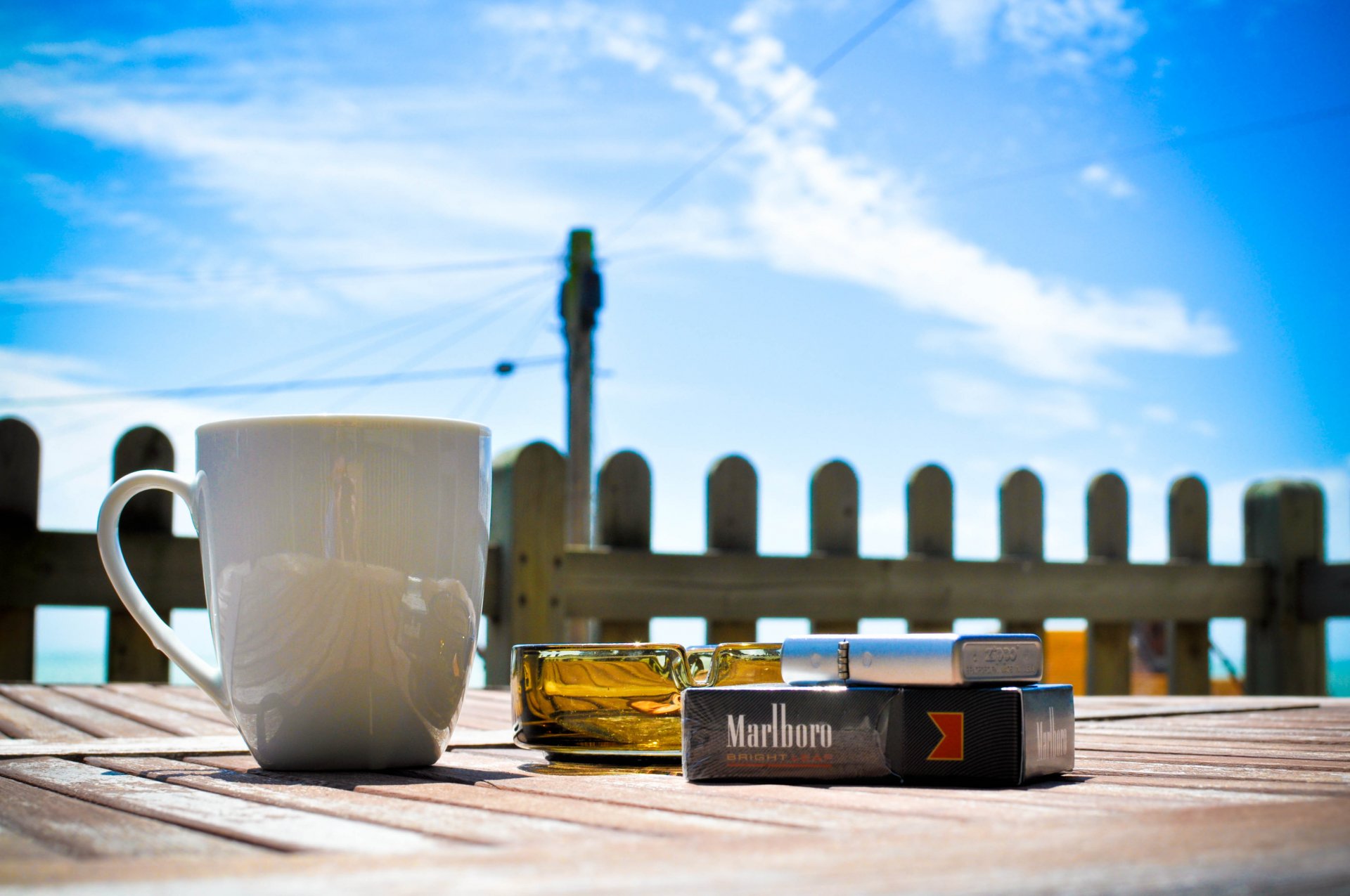 Tasse, aschenbecher, feuerzeug und zigaretten auf einem blauen himmelshintergrundTasse, Aschenbecher, Feuerzeug und Zigaretten auf einem blauen Himmelshintergrund