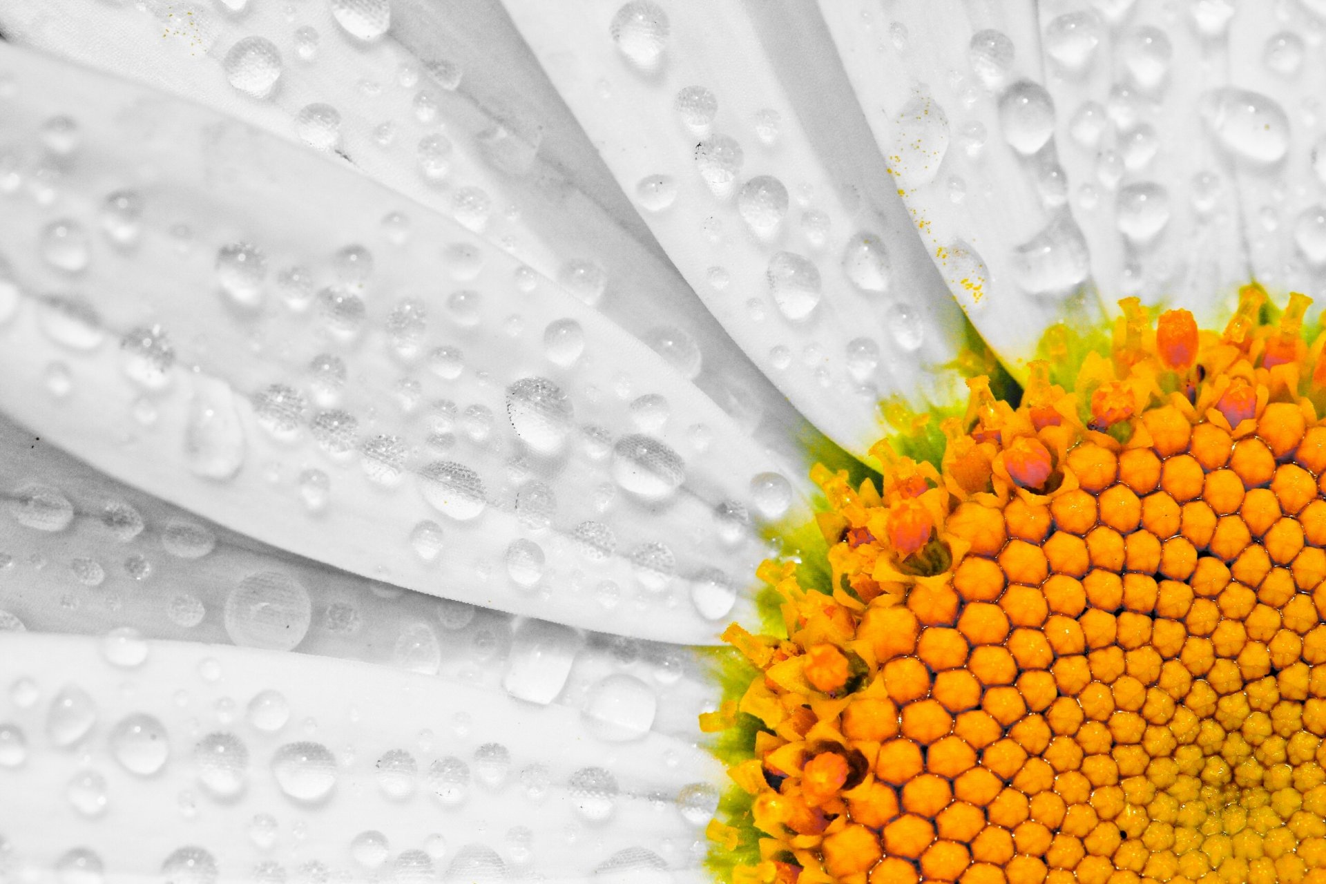 Makrofoto von Kamille mit Tau auf Blütenblättern