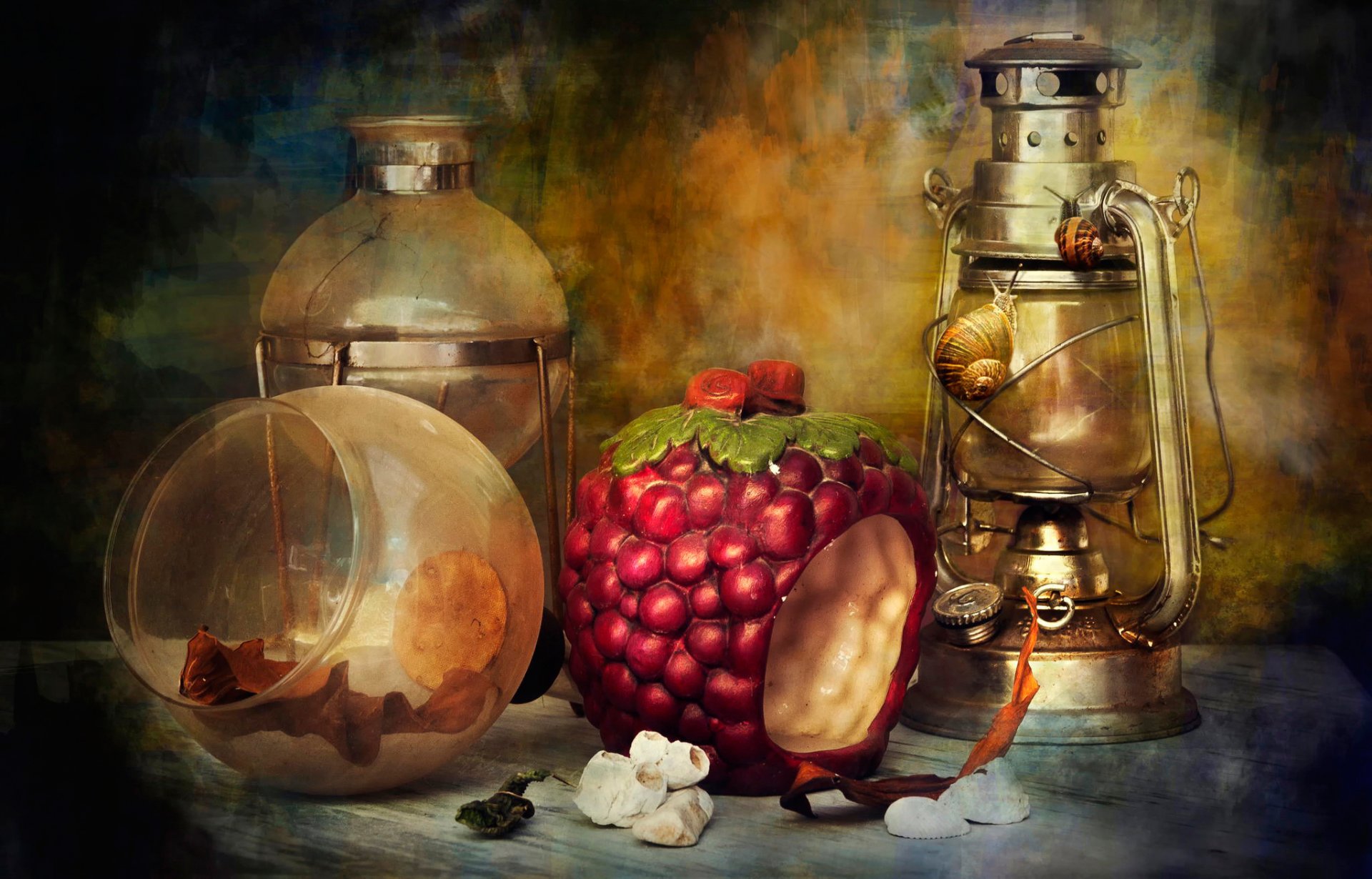 Stillleben blumen in der teekanne, brot, orangen und kürbisseStillleben Blumen in der Teekanne, Brot, Orangen und Kürbisse