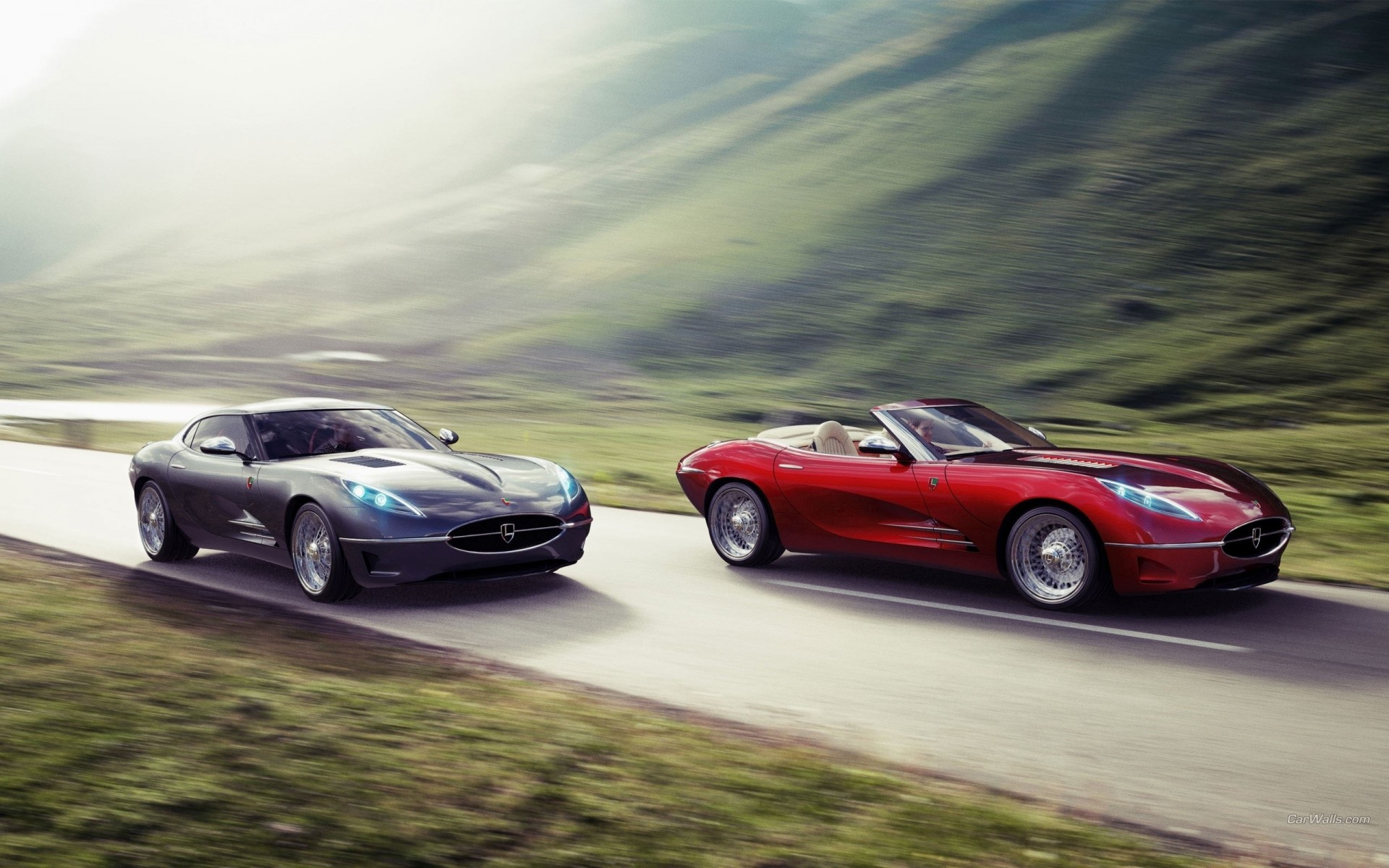 Ein blaues auto der firma maserati rast über die brücke der modernen stadtEin blaues Auto der Firma Maserati rast über die Brücke der modernen Stadt