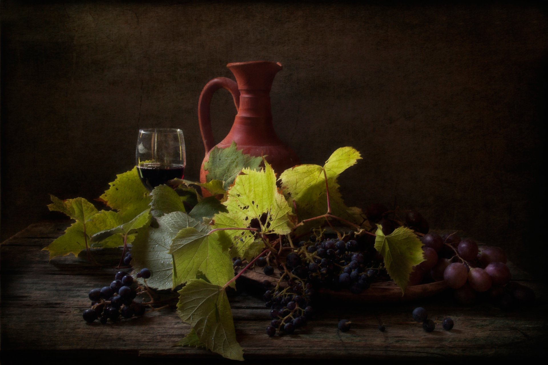 Ein Krug, der in Trauben und Blättern ertrinkt