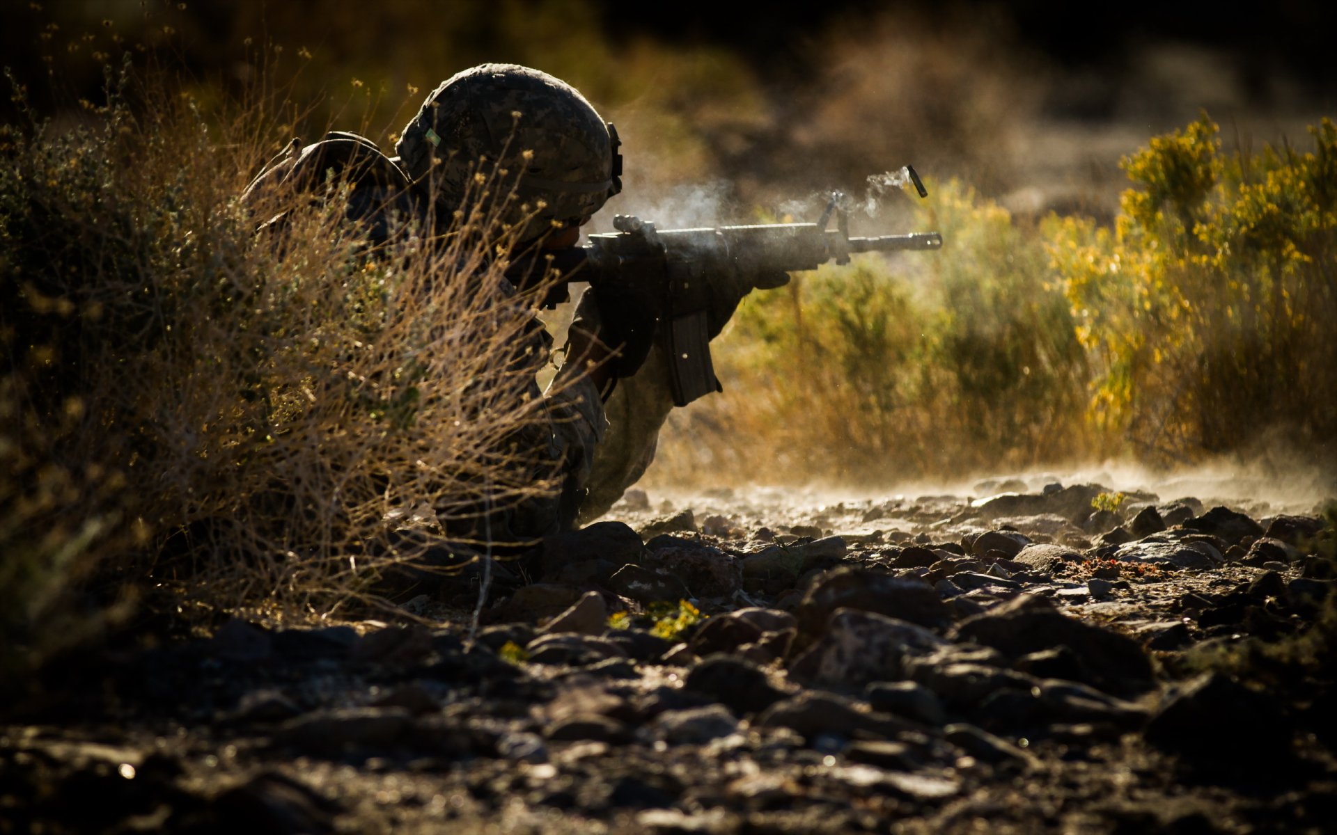 Ein Soldat auf einem Posten mit einer Waffe vor dem Hintergrund des Nachthimmels
