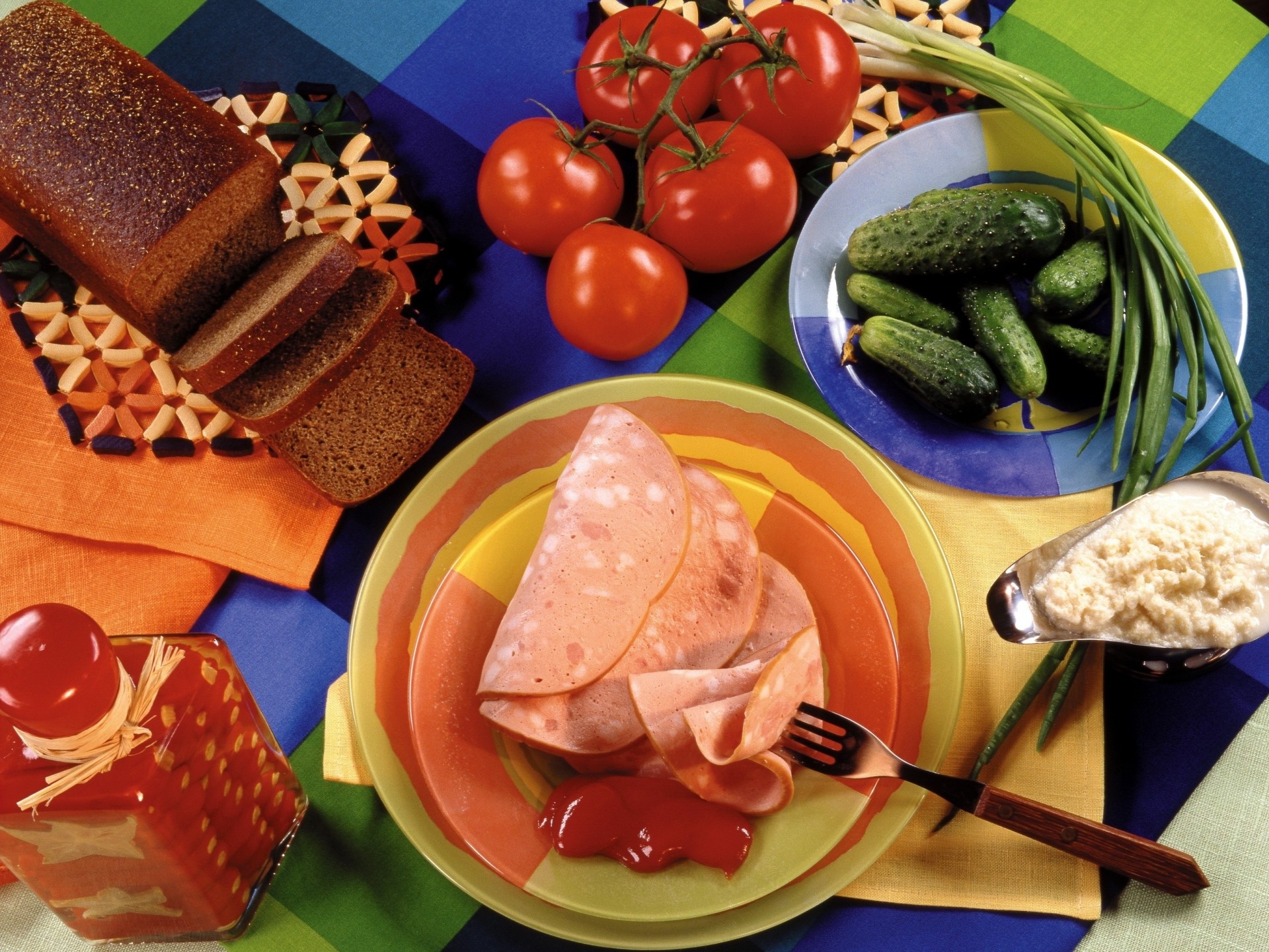 Gemüsekorb mit Tomaten, Gurken und Paprika