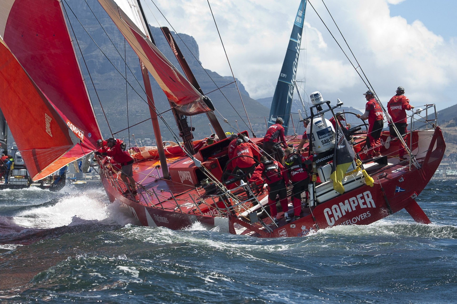 Menschen auf einer roten Yacht mitten im Ozean