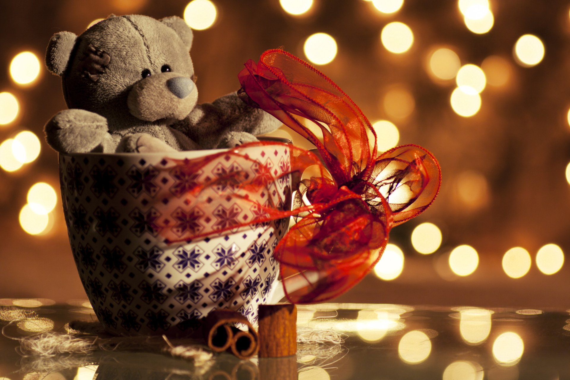 Teddybär verpackt in einem Topf mit rotem Geschenkband