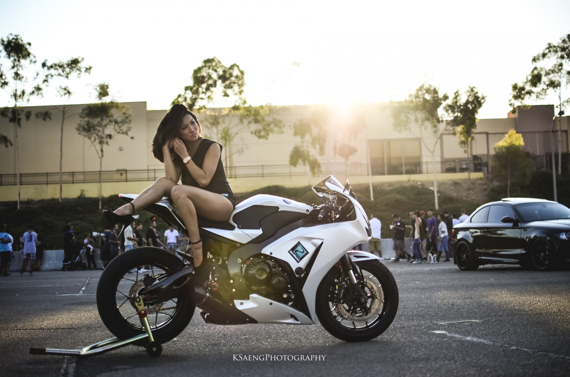 Yamaha Motorrad. Asiatische Mädchen posiert im Hintergrund