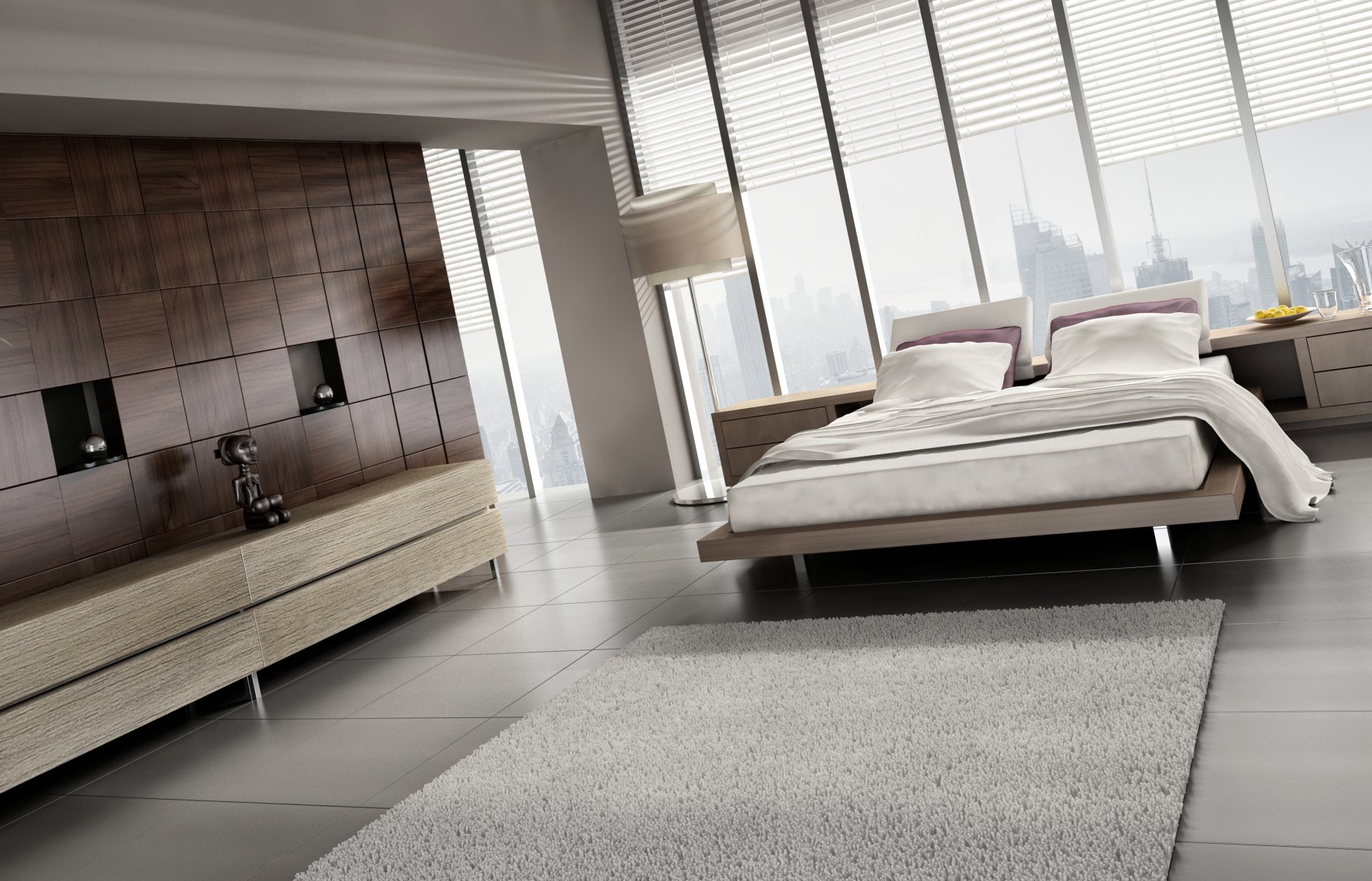 Stilvolles Interieur des Schlafzimmers mit Panoramafenstern