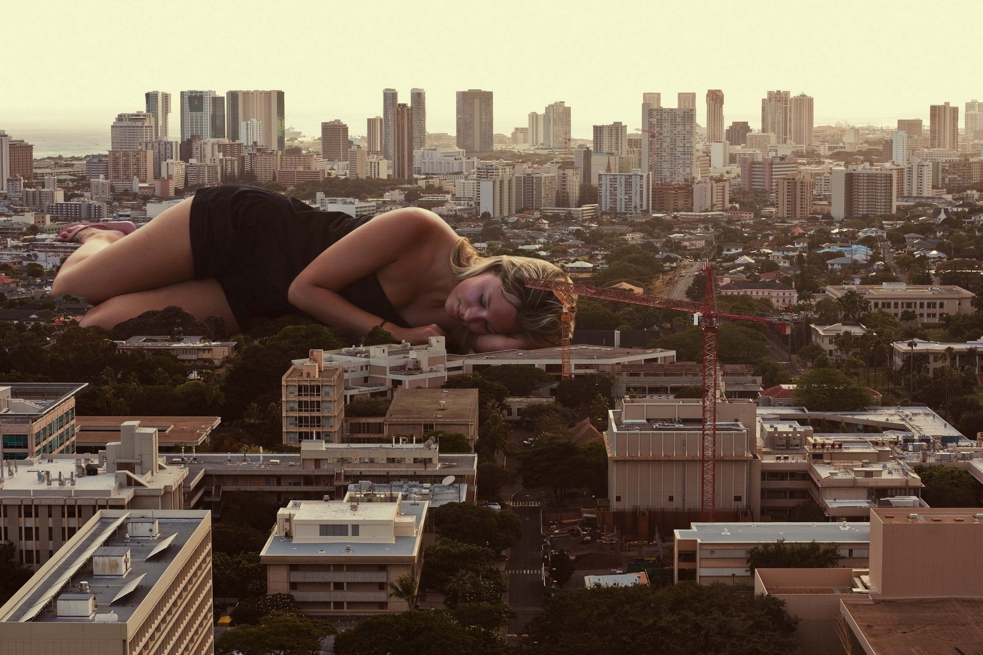 Ein Riesenmädchen schläft auf den Straßen der Stadt
