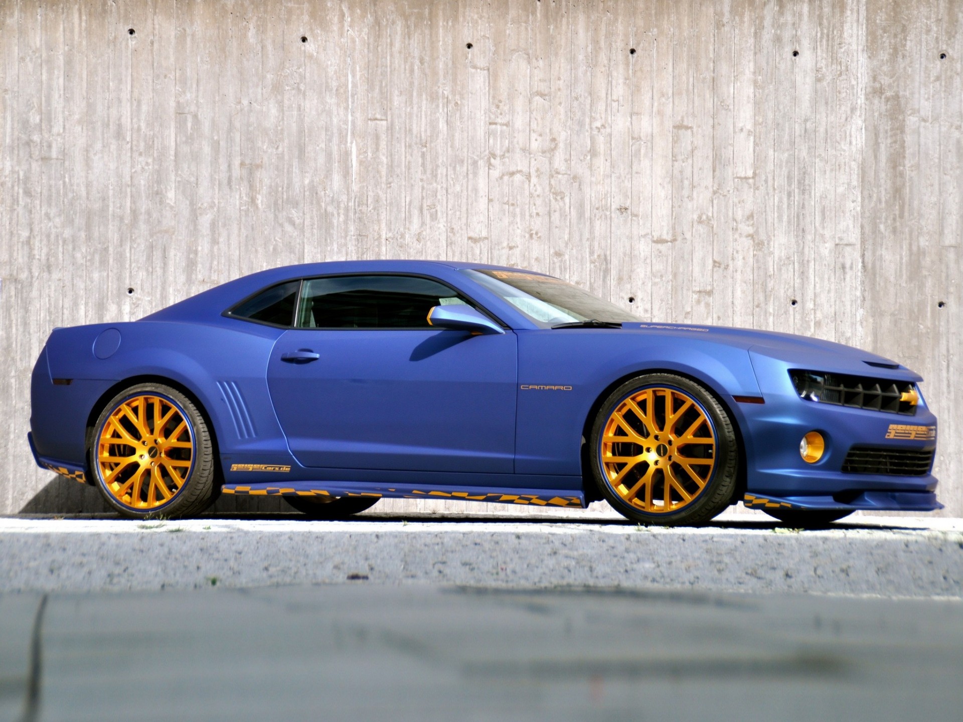 Blaues mattes Auto mit gelben Alufelgen
