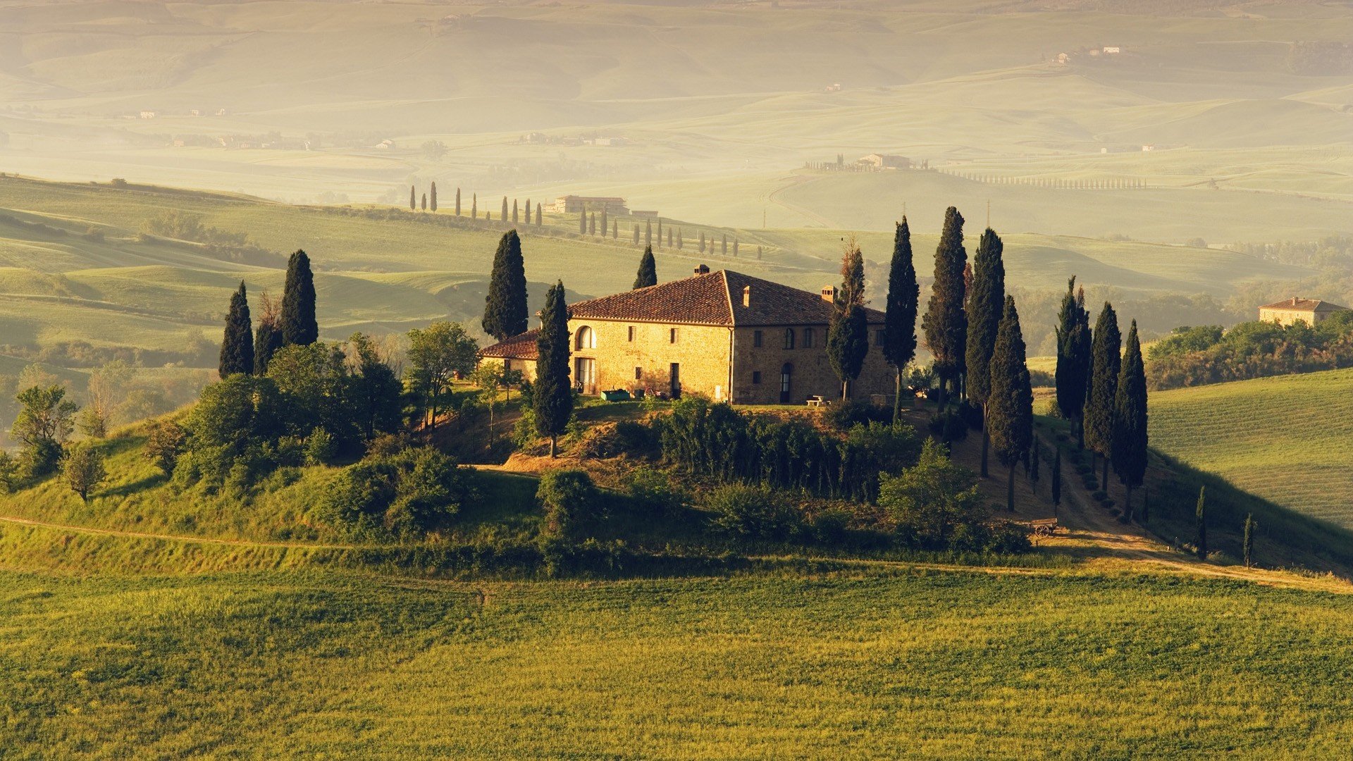 Ein Haus auf einer grünen Wiese auf einem Hintergrund von Bäumen