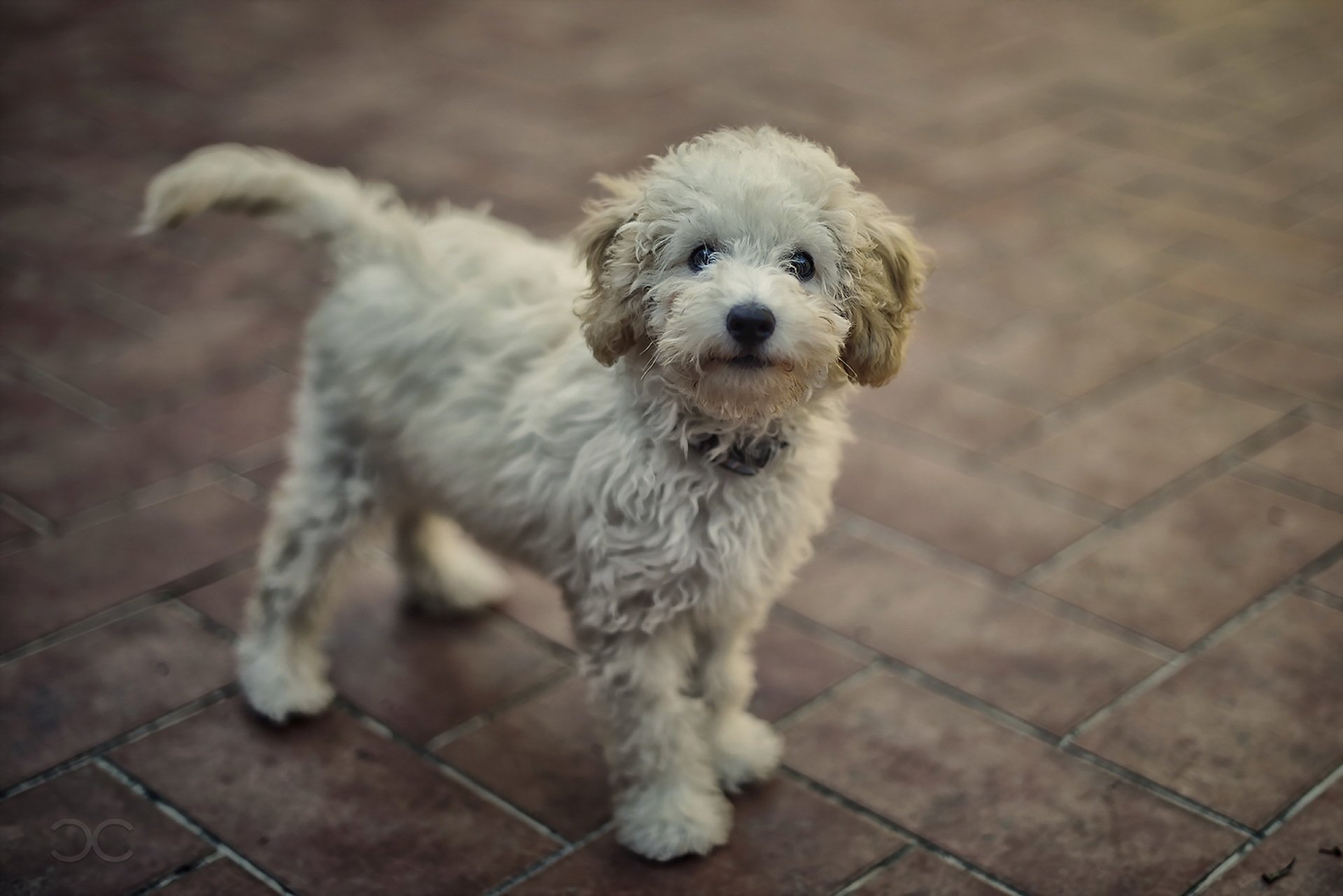 Ein Hund mit einem interessanten Blick auf die Bretter