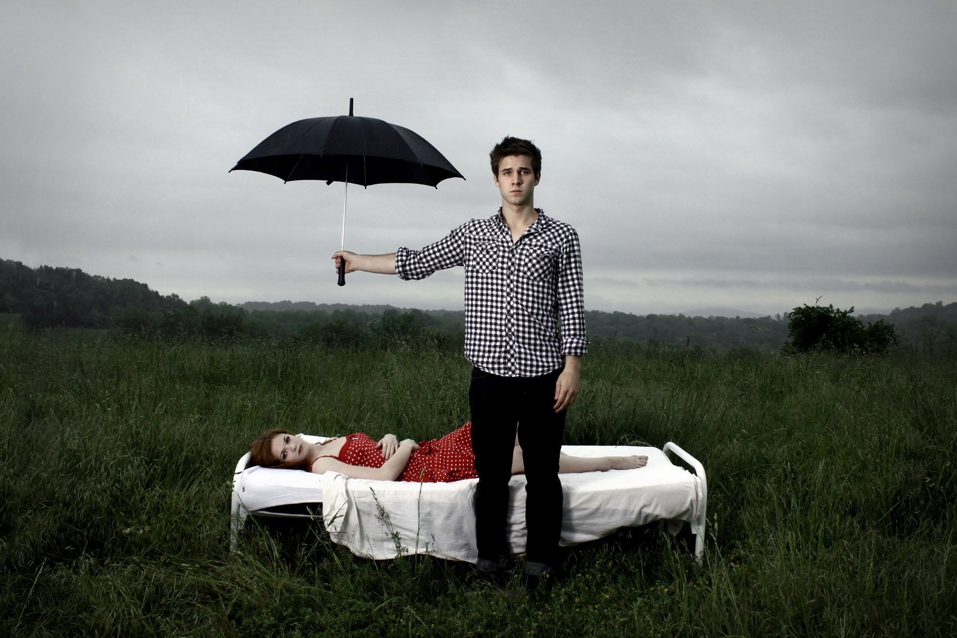 Ein Mann hält einen Regenschirm über ein liegendes Mädchen