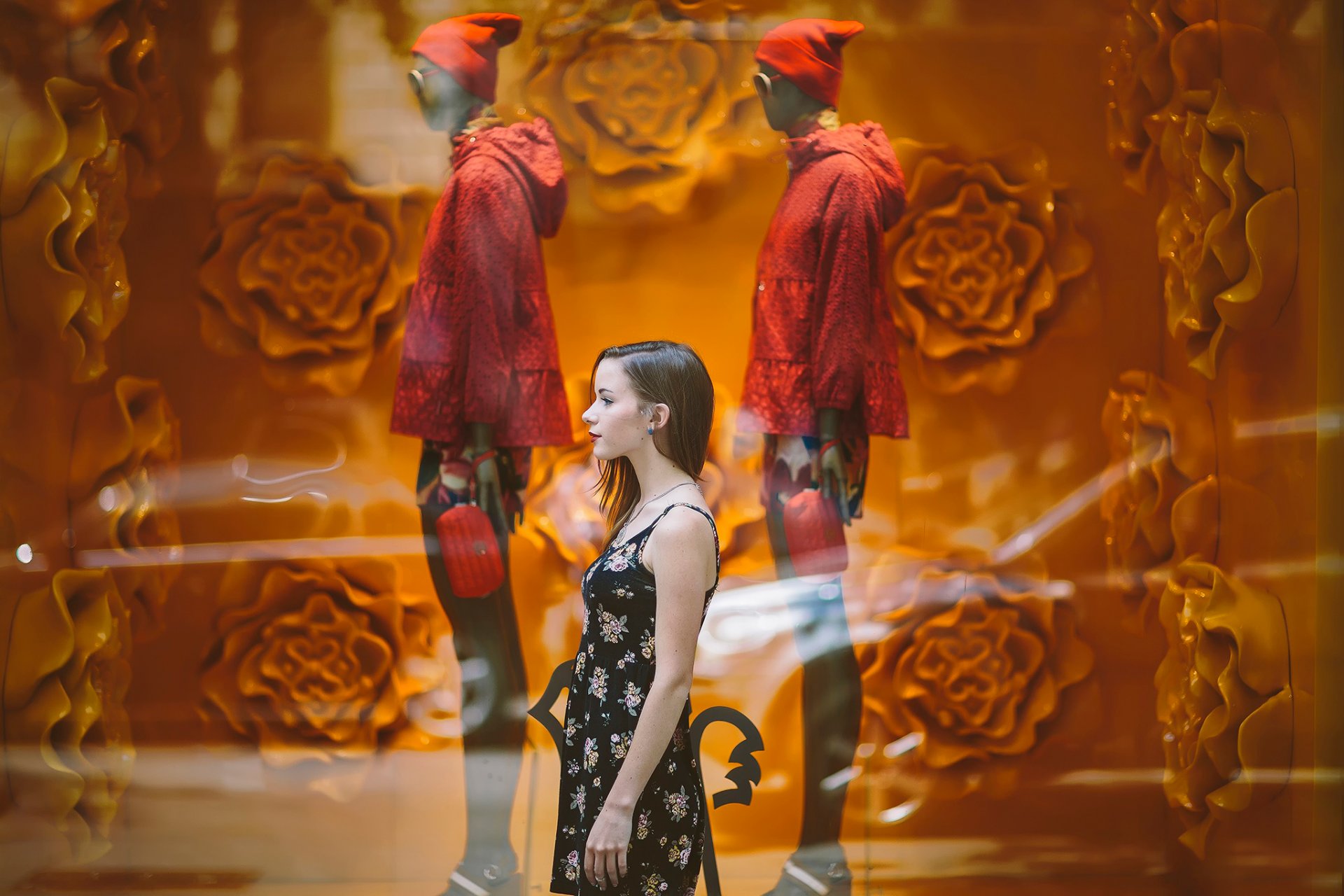 Statue in New York vor dem Hintergrund der nächtlichen Stadt