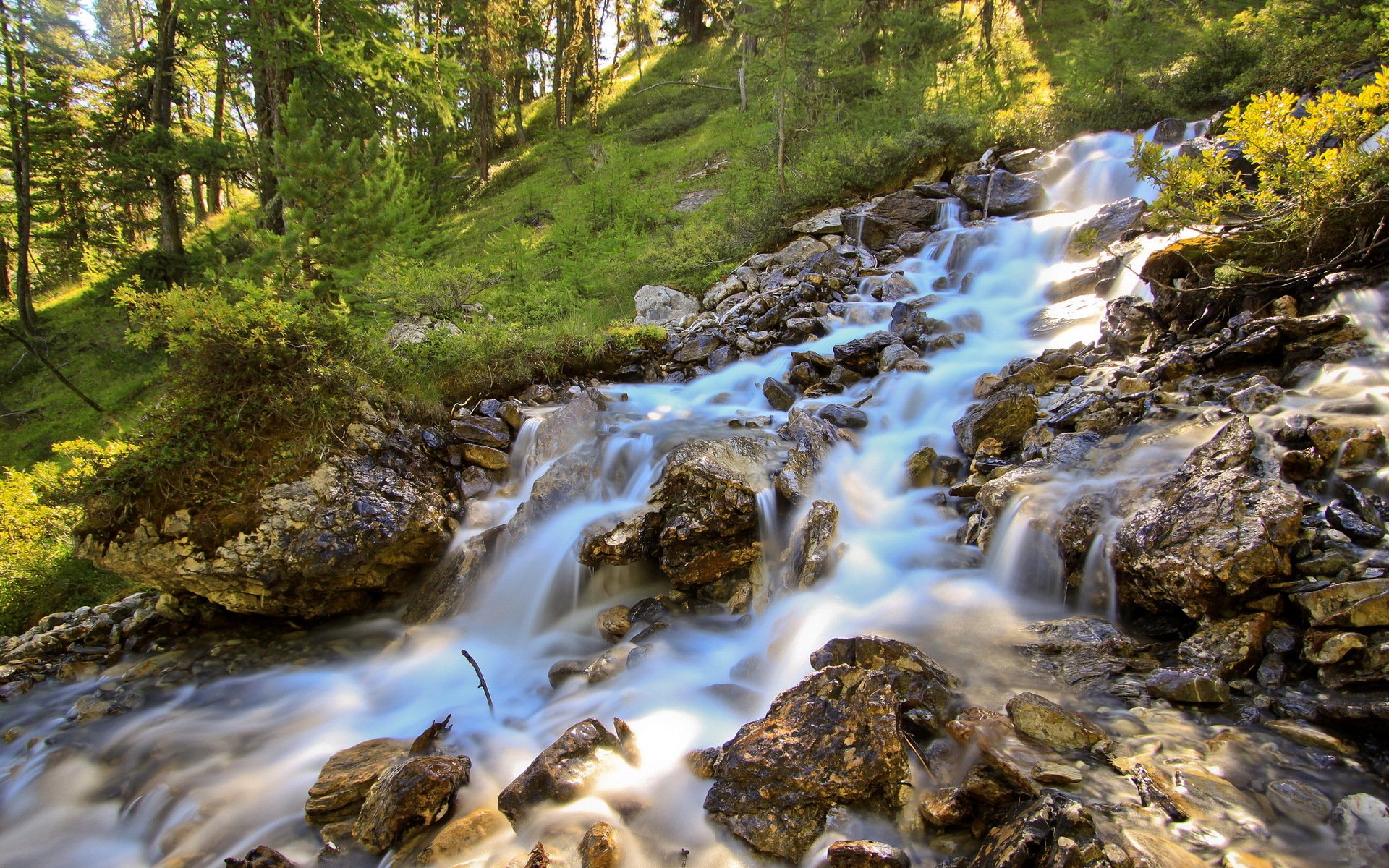 Ein Bergfluss im alten Wald