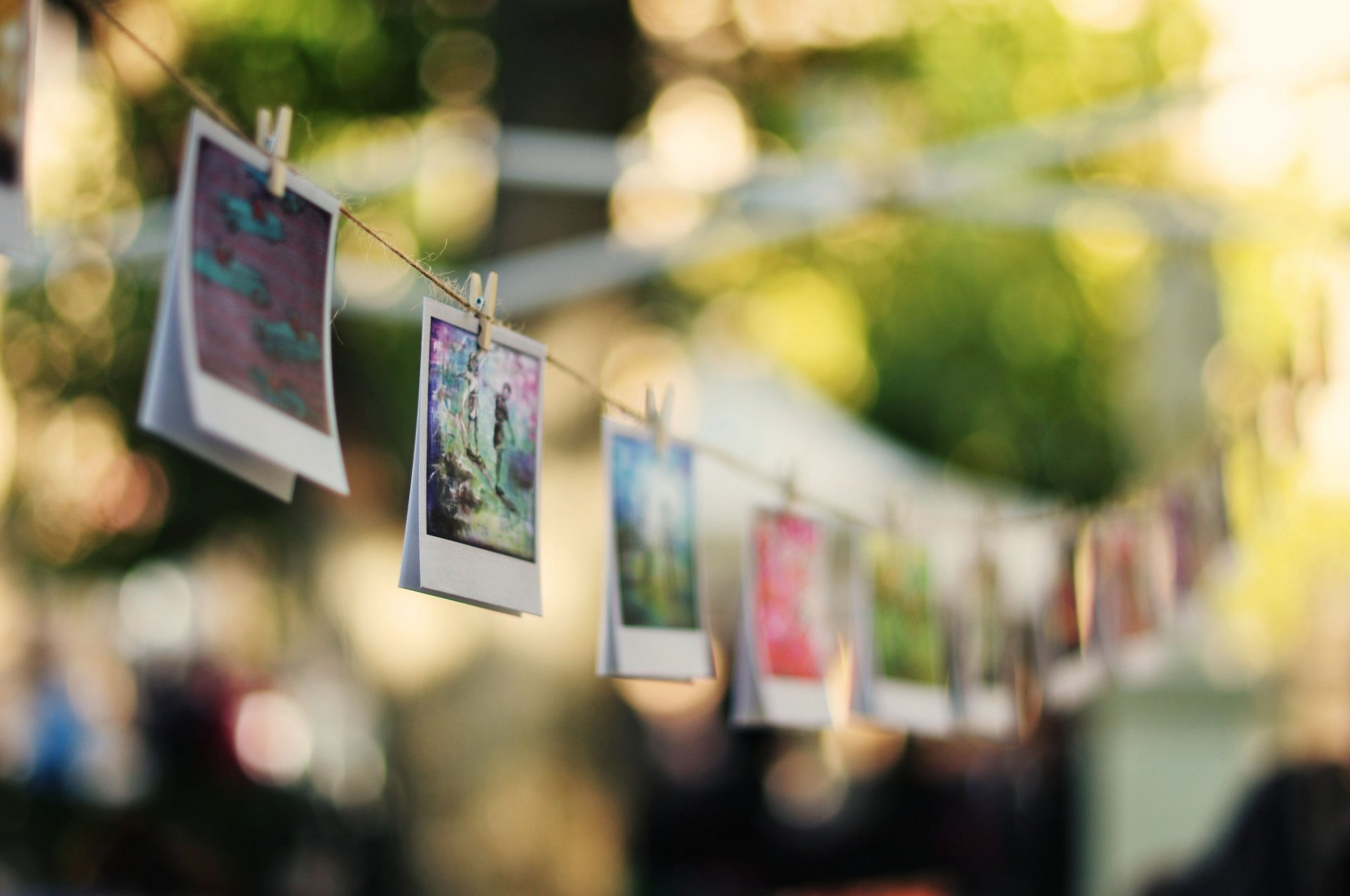 Laterne auf dem Tisch mit Fotos und einer Girlande