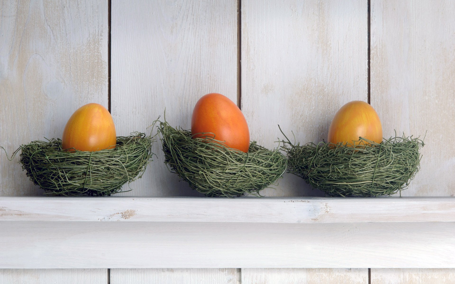Drei Eier sind im Nest auf einem Regal im Dienst