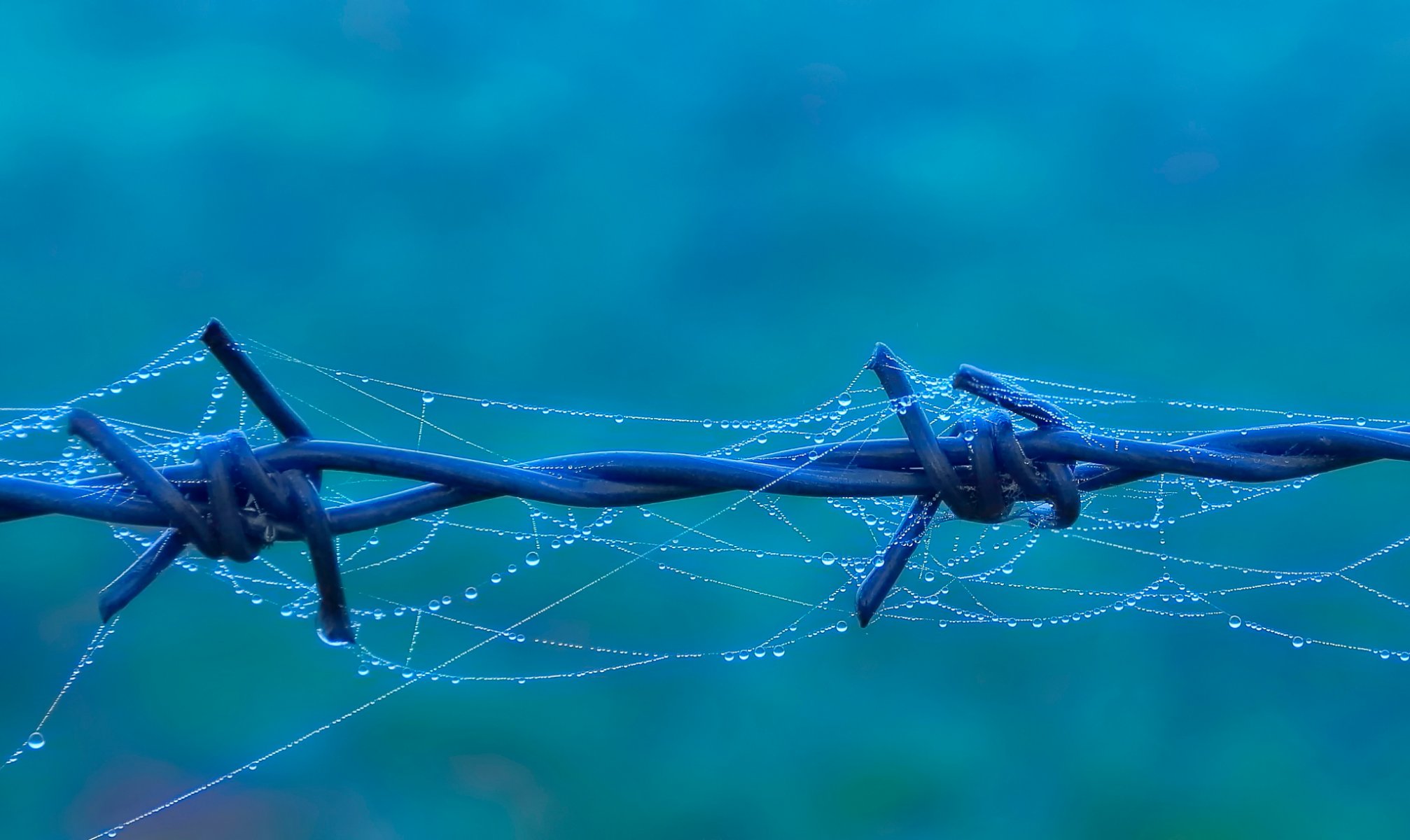 Auf Stacheldraht ein Spinnennetz mit Wassertropfen