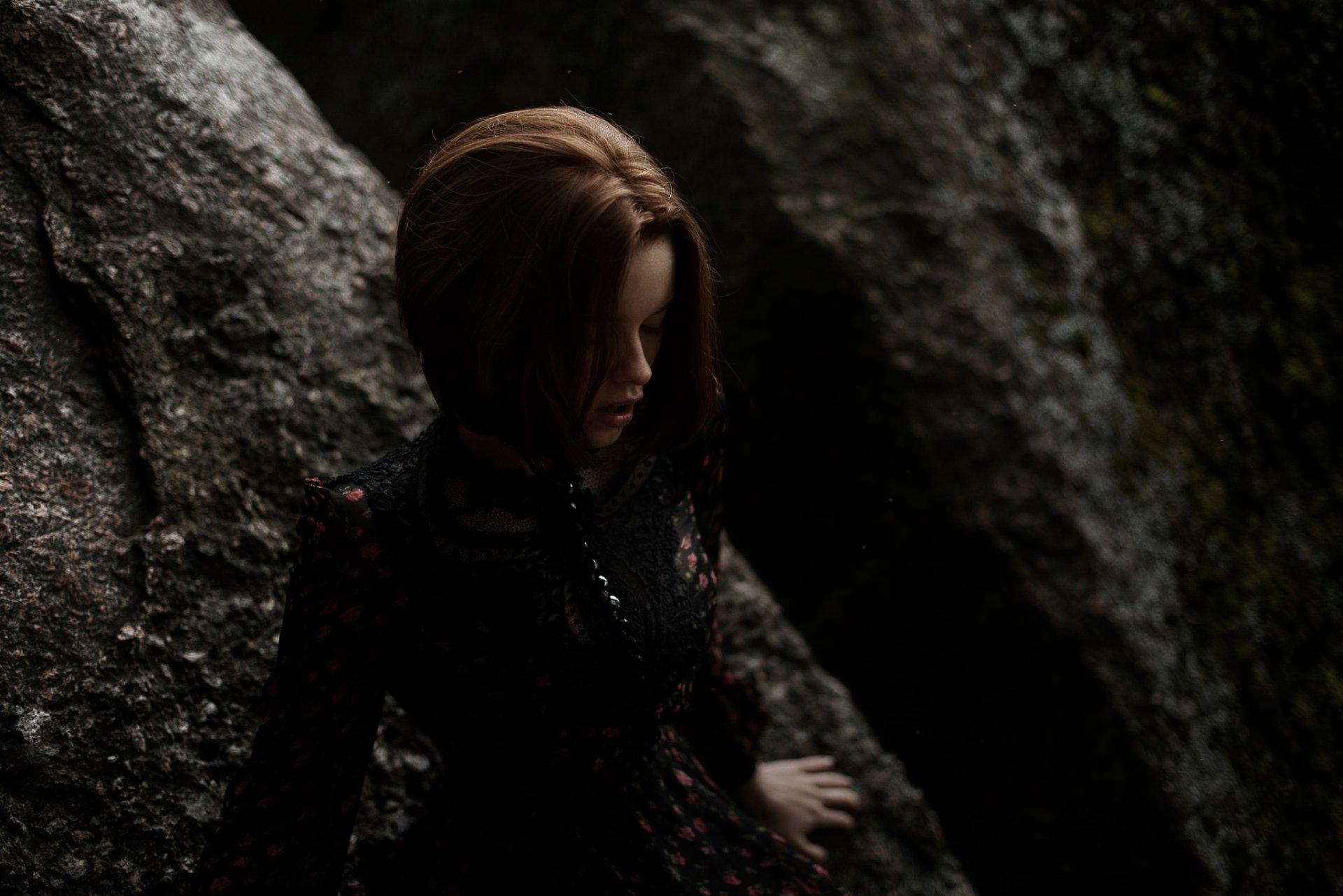 Das Mädchen, das mit den Händen in einem großen Stein ruht