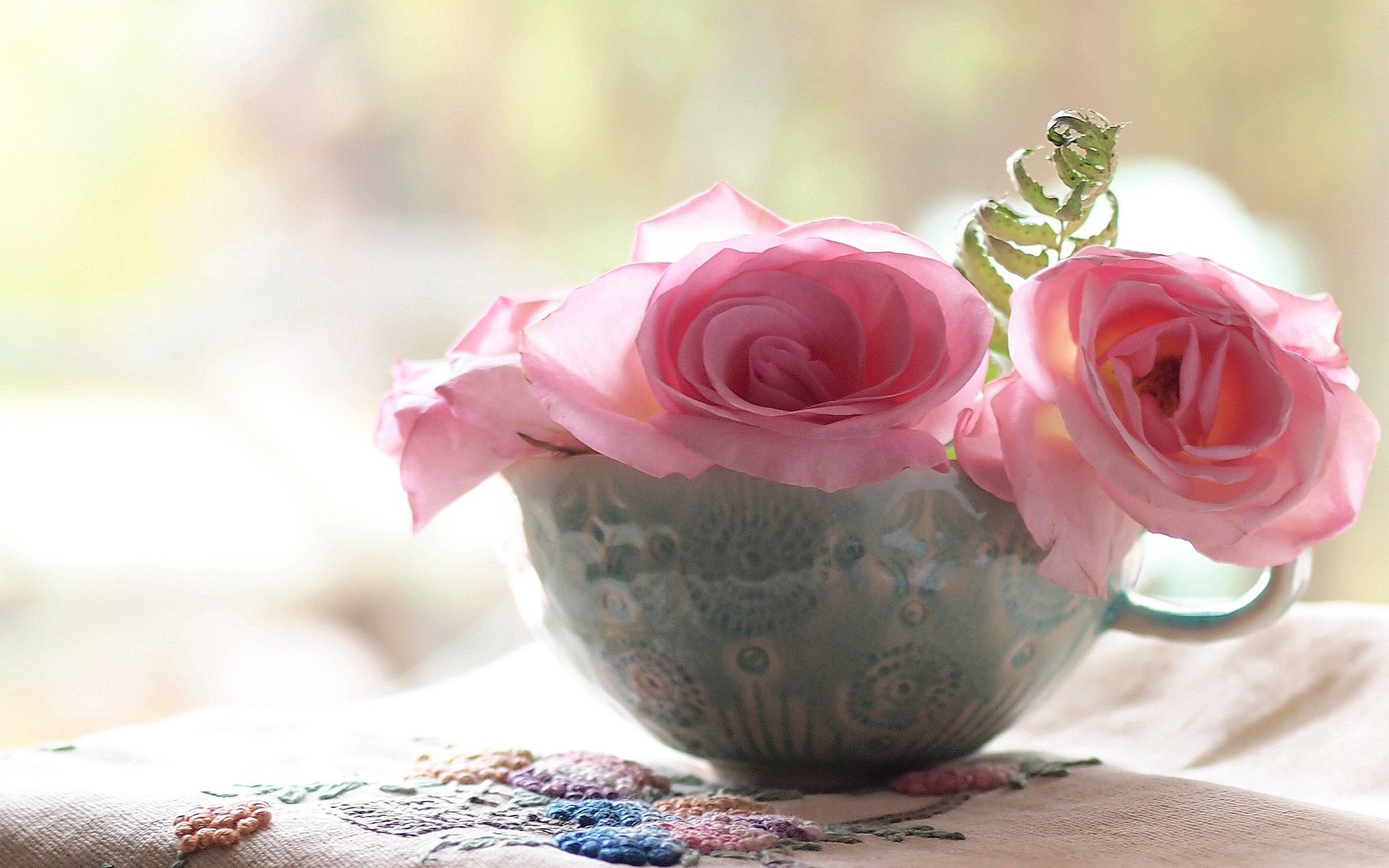 Tasse mit Rosen in der Nähe einer bestickten Serviette