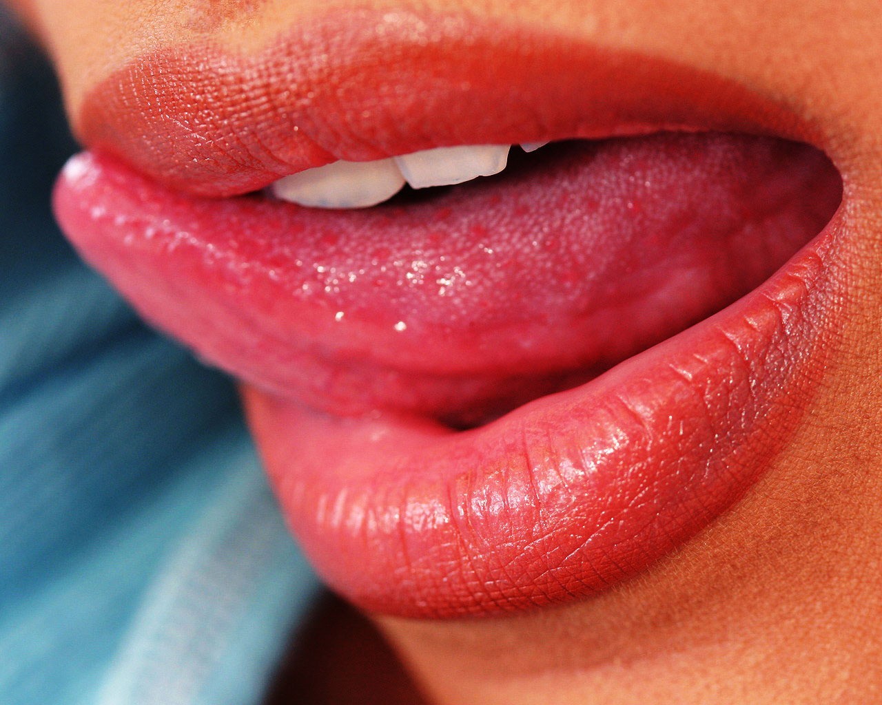 Hund mit ausgestreckter Zunge vor einem Hintergrund von Wolken