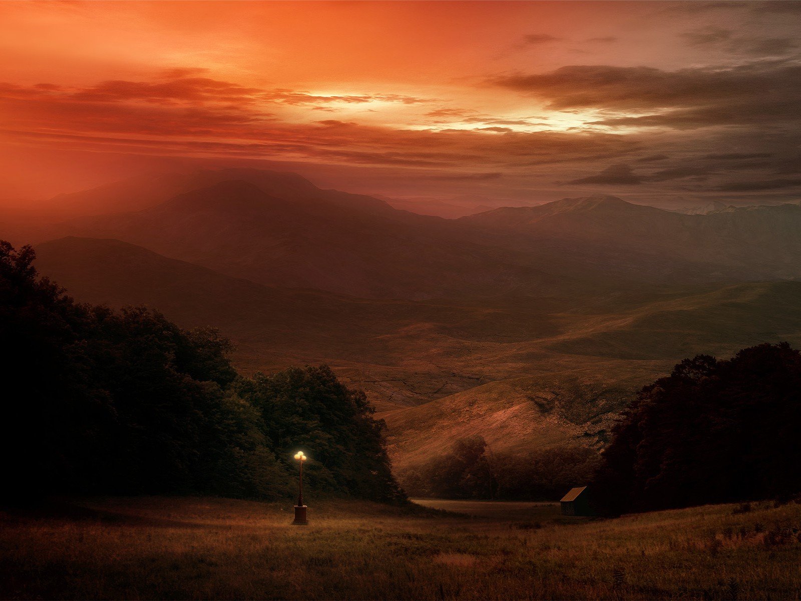 Einsame Laterne auf dem Hintergrund der schönen Berge