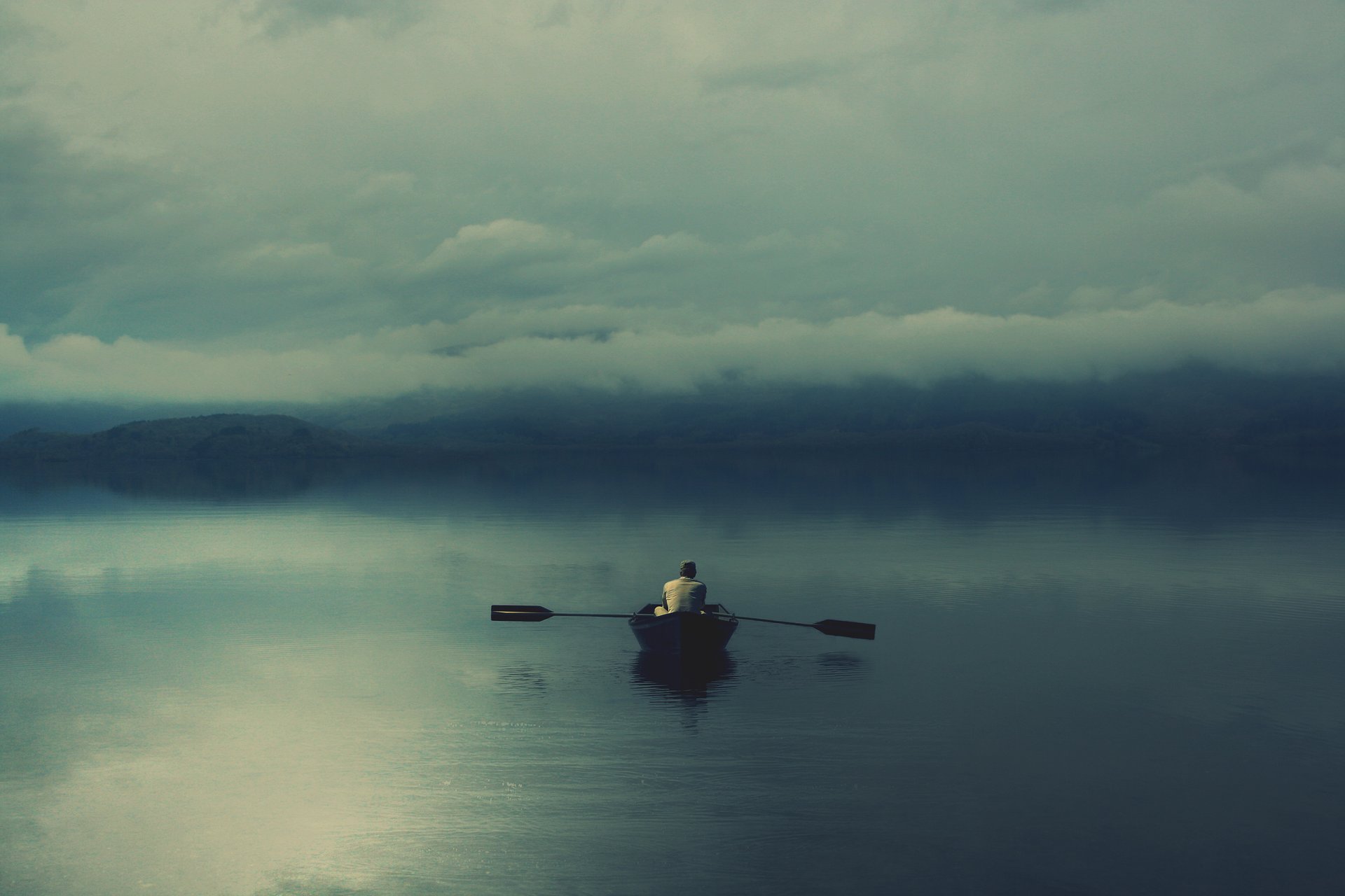 Ein einsamer Stein mitten am bewölkten Tag am See