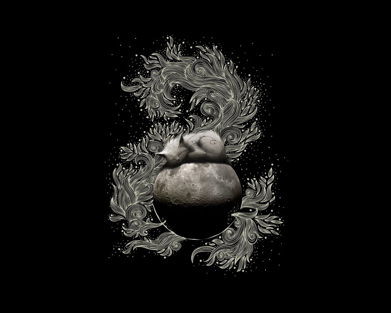 Zwei Wölfe in der Dunkelheit unter dem Mond weiß und schwarz