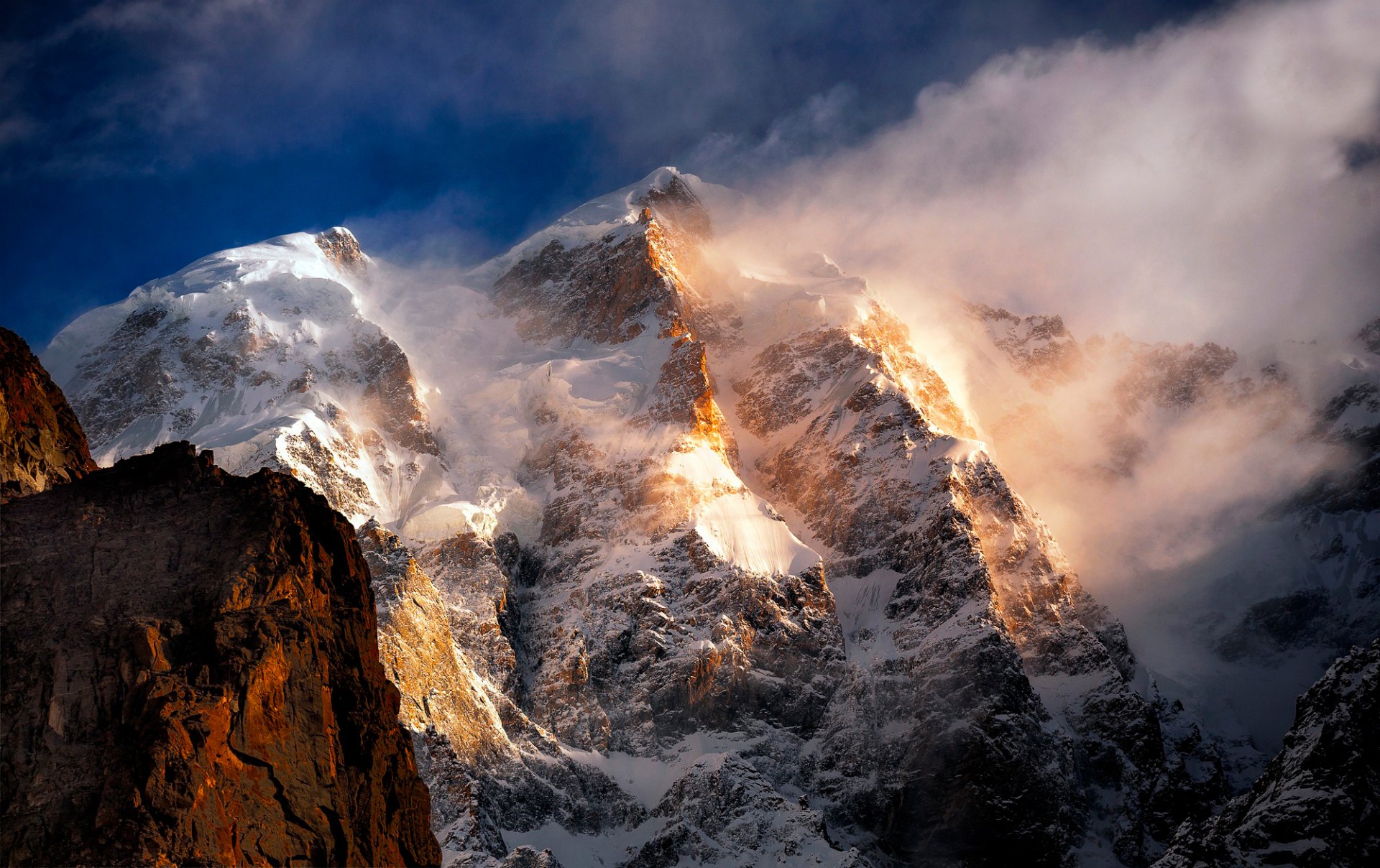 Schneebedeckte Berge, auf denen das Sonnenlicht scheint
