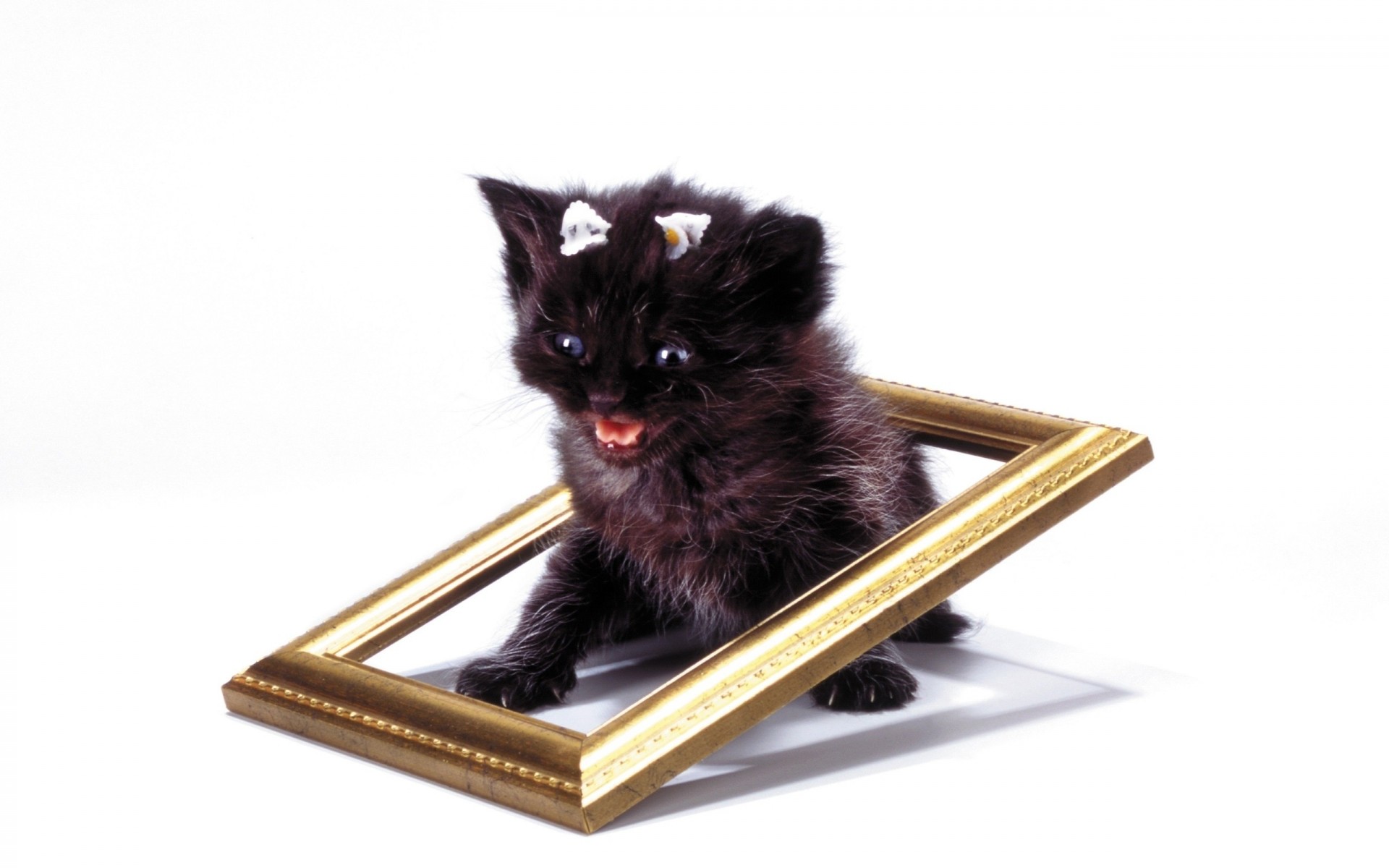 Das Kätzchen schreit verängstigt, während es im Rahmen sitzt
